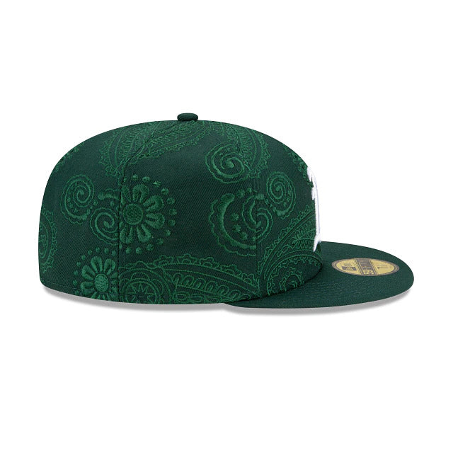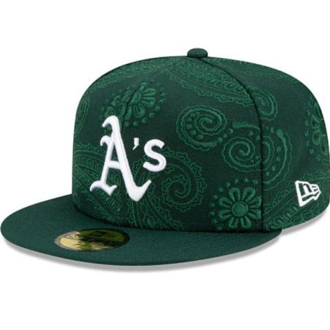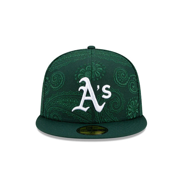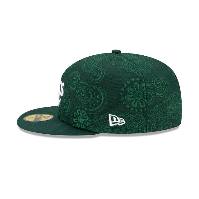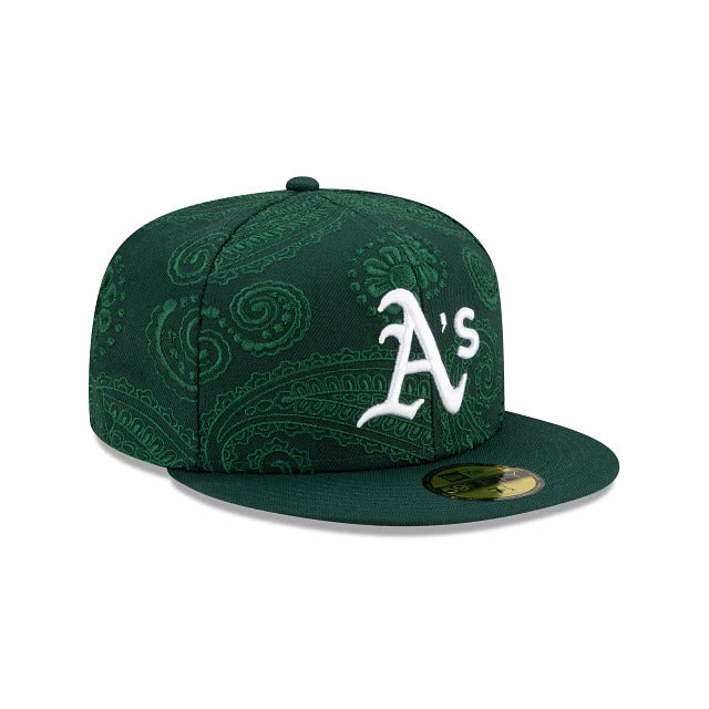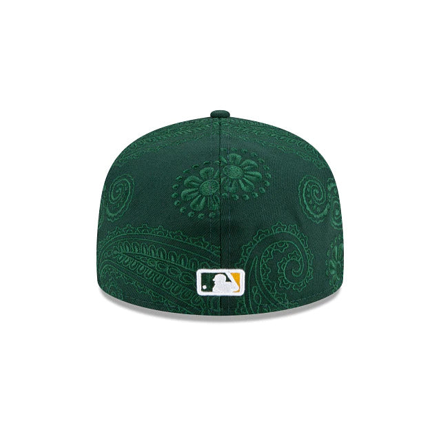 Enter the vortex with the Oakland AthleticsSwirl 59FIFTY Fitted Cap featuring a tonal paisley embroidery throughout the crown with the teams logo embroidered at the front panels with a MLB Batterman logo at the rear and a gray undervisor.