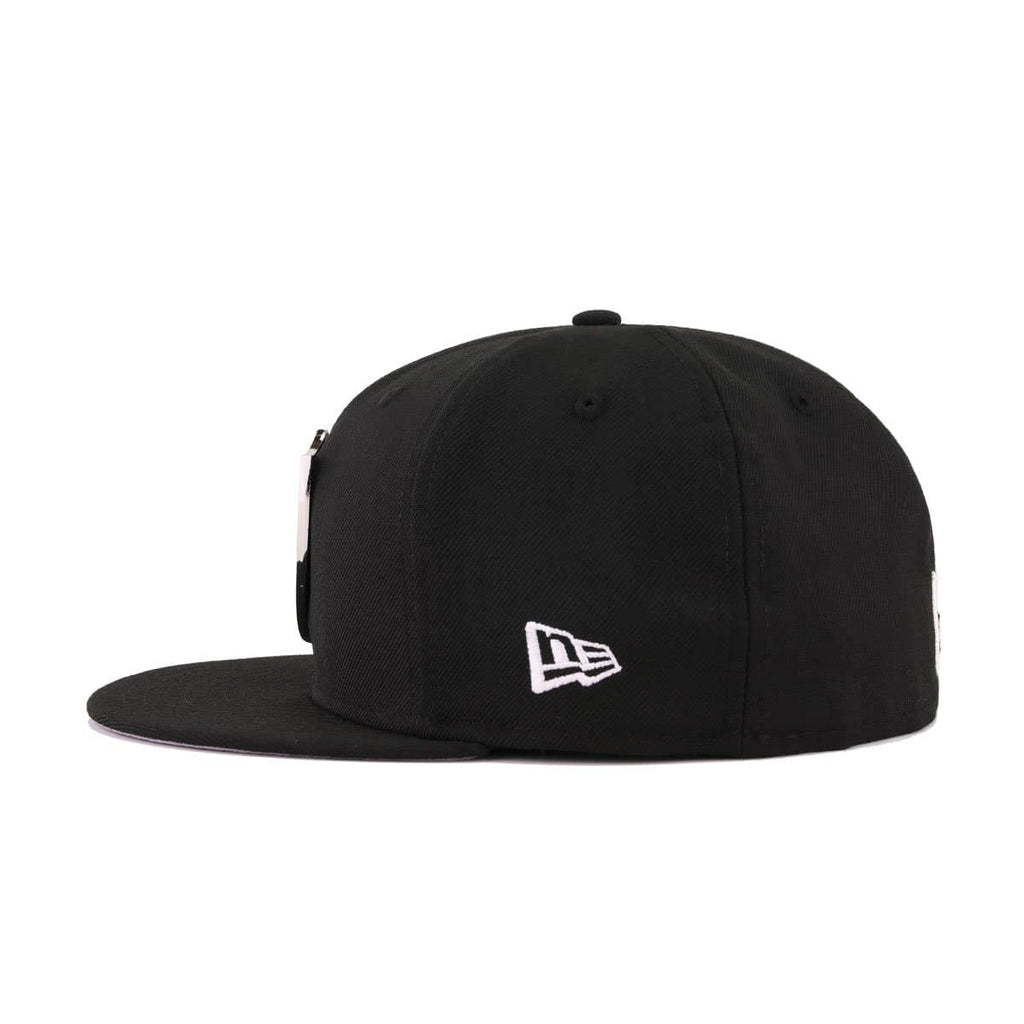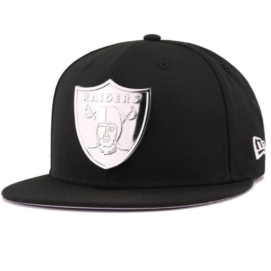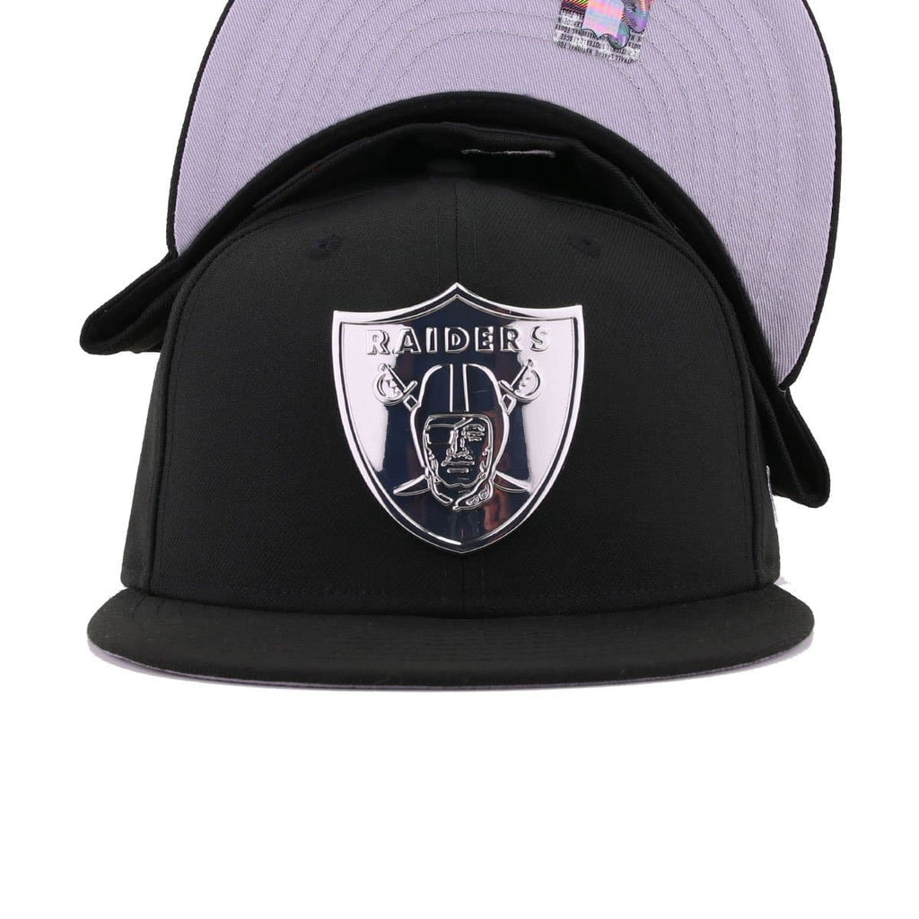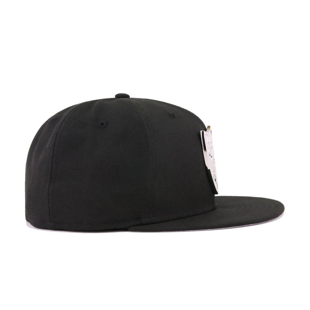 Represent Raider Nation proudly with this unique fitted hat in one of the cleanest colorways. It features one of New Era's more recent innovations in logo fabrication: fully metal badges. They are constructed with durable rivets to attach the logo to the crown, and the detail of the badges are second to none. New Era flag on the left side done in Metallic Silver thread, with an NFL shield done in Black/Metallic Silver placed on the rear of the hat. Represent one of the NFL's most storied franchises with this custom-made fitted from Hat Heaven and New Era.