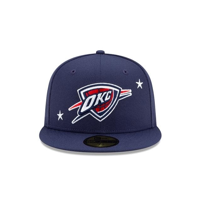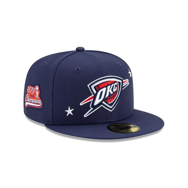 The Oklahoma City Thunder Americana 59FIFTY Fitted Cap features an embroidered Oklahoma City Thunder logo at the front panels with star embroideries throughout the crown. Additional details include a NBA Champions patch at the right-wear side, the NBA logo at the rear and a gray undervisor.