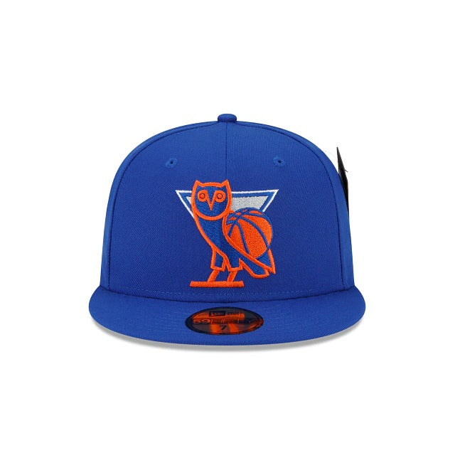 October's Very Own. The OVO x New York Knicks 59FIFTY Fitted Cap features a team color OVO graphic embroidered at the front panels with a Knicks logo at the rear and a gray undervisor.