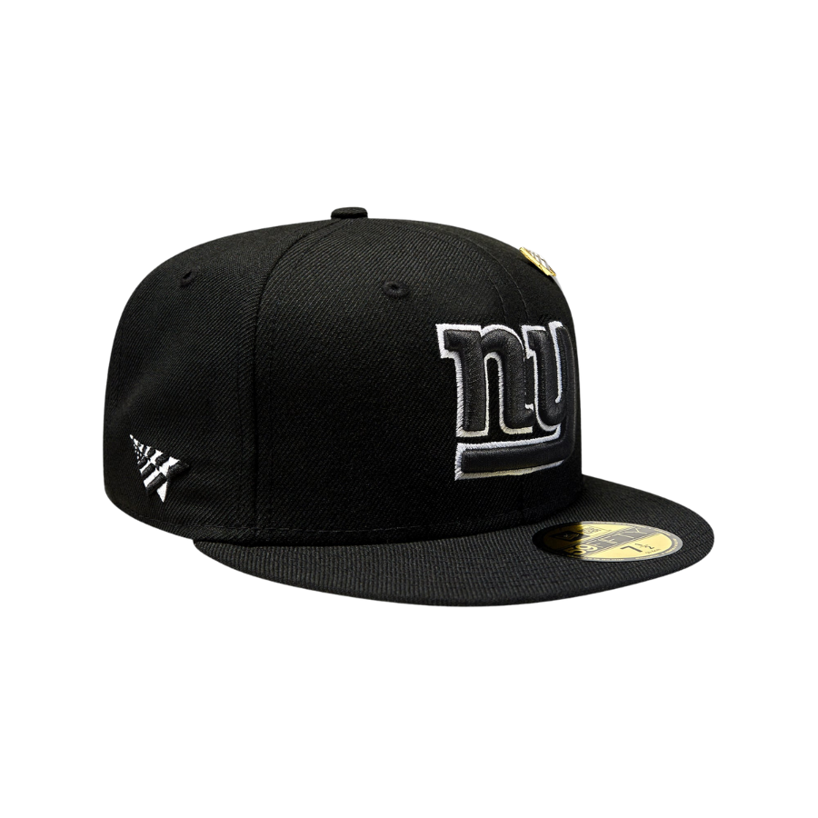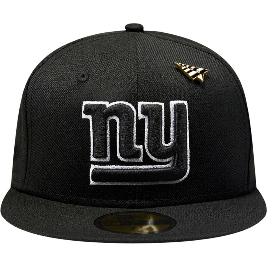 This New Era Paper Planes x New York Giants 59FIFTY Fitted Hat is a collaboration between Paper Planes x New Era & the NFL. The fitted has a black six panel structured high crown, embroidered eyelets and fabric squatchee button. The flat bill of the fitted cap is also black with a green undervisor and white sweatband. The front panel features the NFL team logo embroidery. The left panel of the fitted displays the New Era logo and the Paper Planes logo on the right panel. The NFL shield is embroidered on the rear crown.