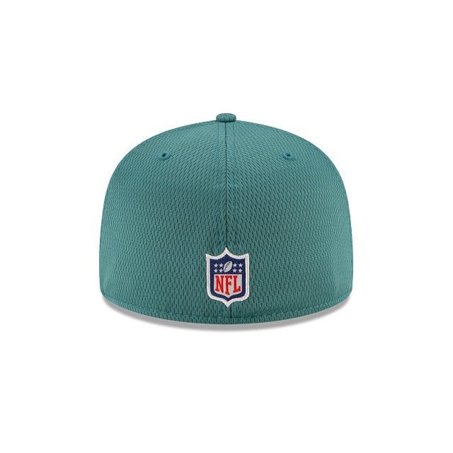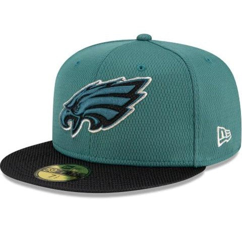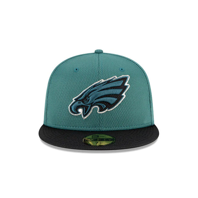 Travel in style with the Philadelphia Eagles Official NFL Sideline Road 59FIFTY Fitted Cap featuring a unique two-tone dashmark fabrication with an embroidered team logo at the front panels. Team color accents and the Official NFL Shield at the rear complete the official cap that players, coaches and staff will wear on the sidelines during the 2021 NFL season.