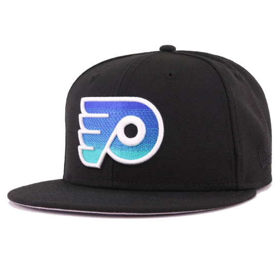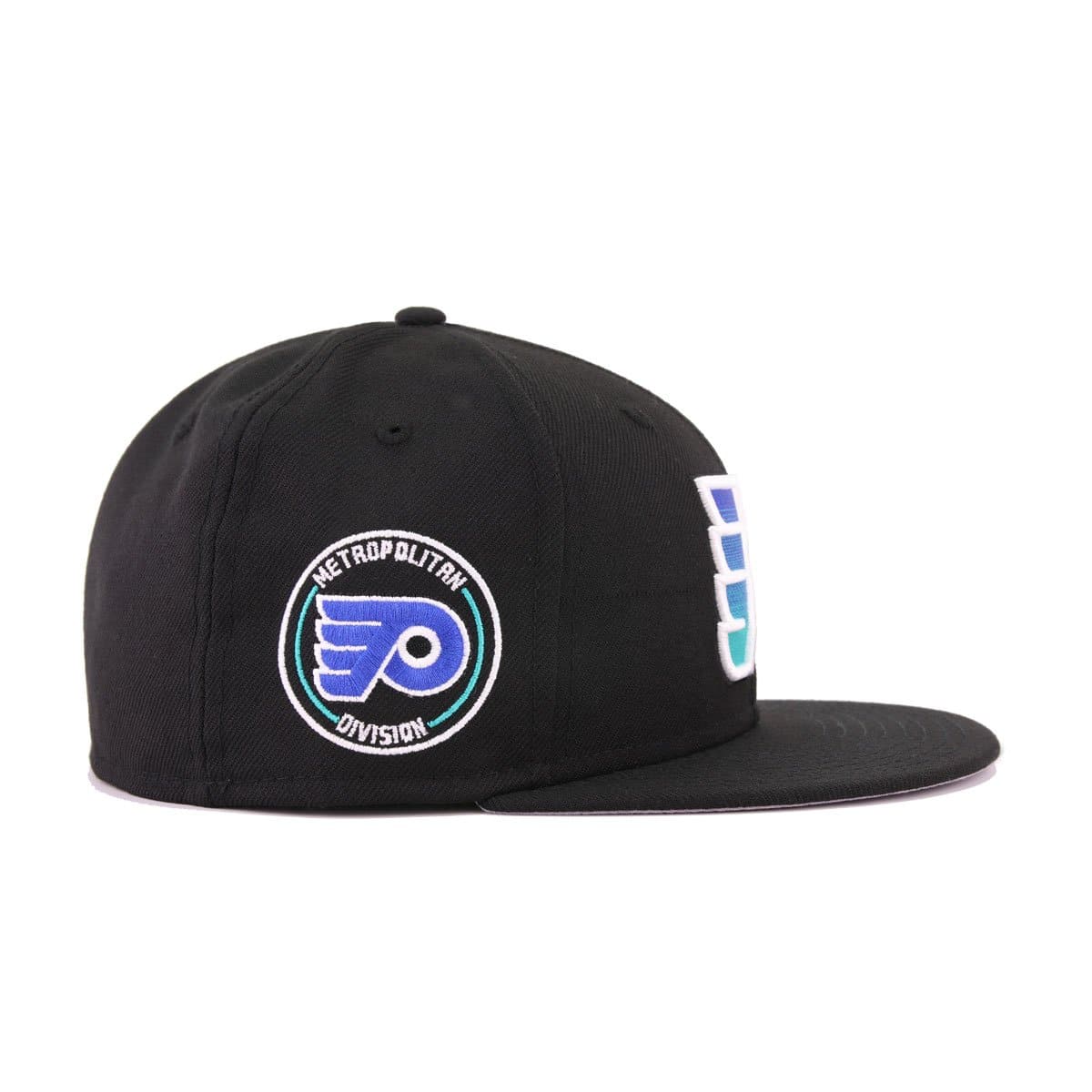 The black-crowned Flyers fitted features a special logo which features a two-color gradient inside the primary logo, blending from Light Royal Blue to Calypso Blue. The side patch denotes the division the Flyers play in and features the same Light Royal Blue/Calypso Blue colorway found in the front logo. Tonal New Era flag and Light Royal/Blue Calypso Blue NHL shield in the rear round out the fitted hat. An exclusive Hat Heaven custom, this is one hat you'll be hard-pressed to find anywhere else.
