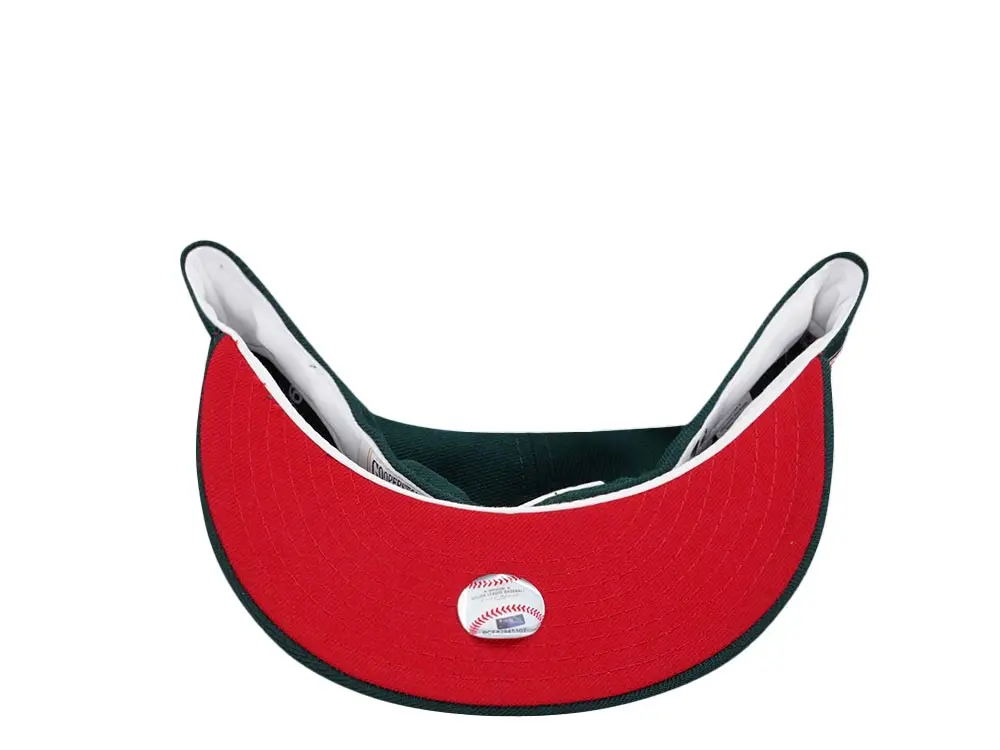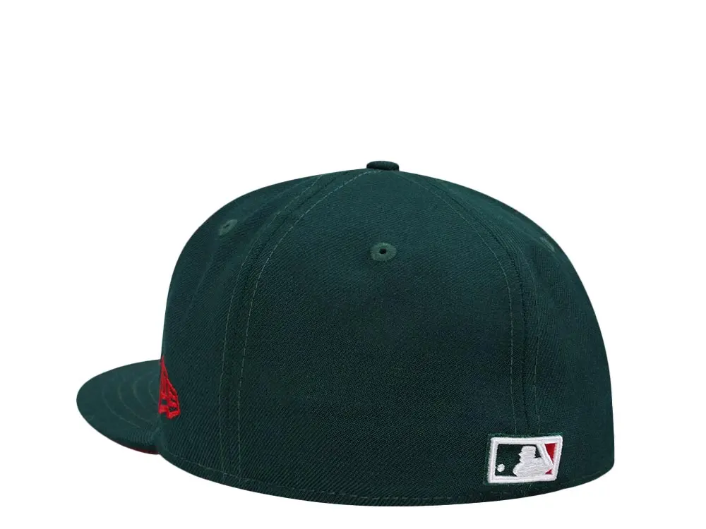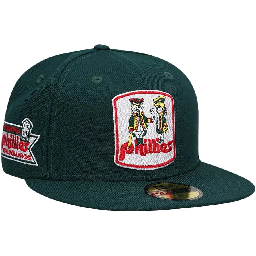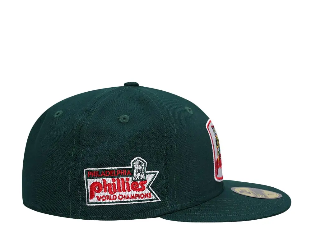 This Philadelphia Phillies fitted hat was released by Topperz Store. The fitted has a dark green six panel structured high crown and embroidered eyelets with a dark green fabric squatchee button. The fitted cap has a dark green flat bill with a red undervisor and white sweatband. The front panel features the Philadelphia Phillies logo embroidery and a 1980 World Champions side patch embroidery on the right panel. The left panel of the fitted displays the New Era logo and the official MLB Batterman logo embroidery on the rear crown.