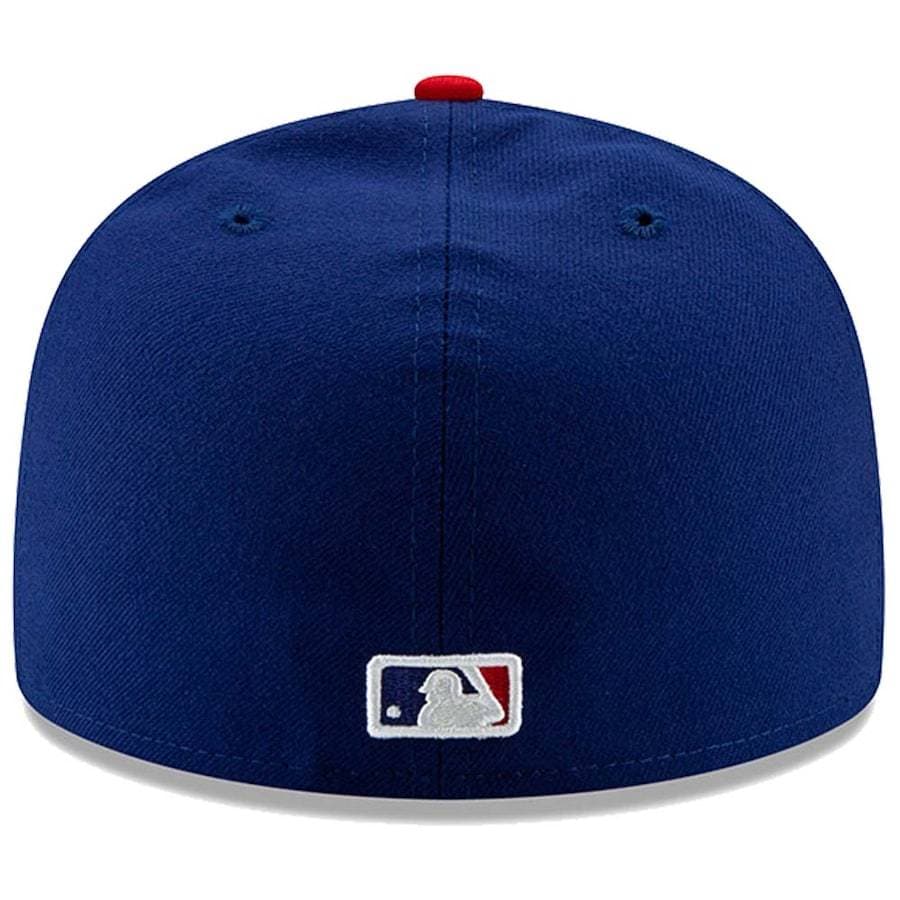 The New Era Philadelphia Phillies Alternate Authentic 59Fifty Fitted Hat has a royal blue, 6 panel, high structure crown and embroidered eyelets. The fabric squatchee button on top of the fitted is red as well as the thread of the iconic New Era logo located on the left side of the hat. The front displays the Philadelphia Phillies team logo in embroidered in red thread with white outline. The back of the fitted hat has the official MLB batterman logo embroidered in red, white and blue threads. Great red and royal blue colorway combination and a great fitted.