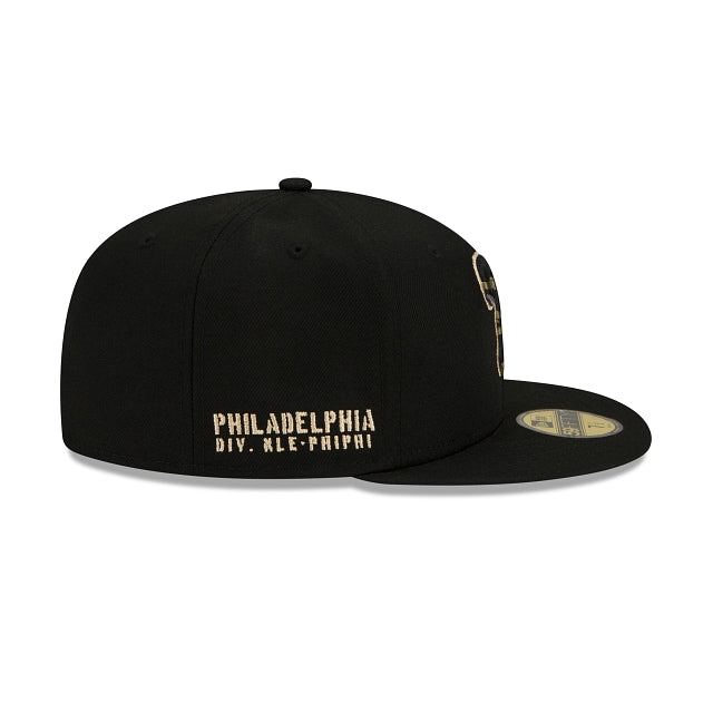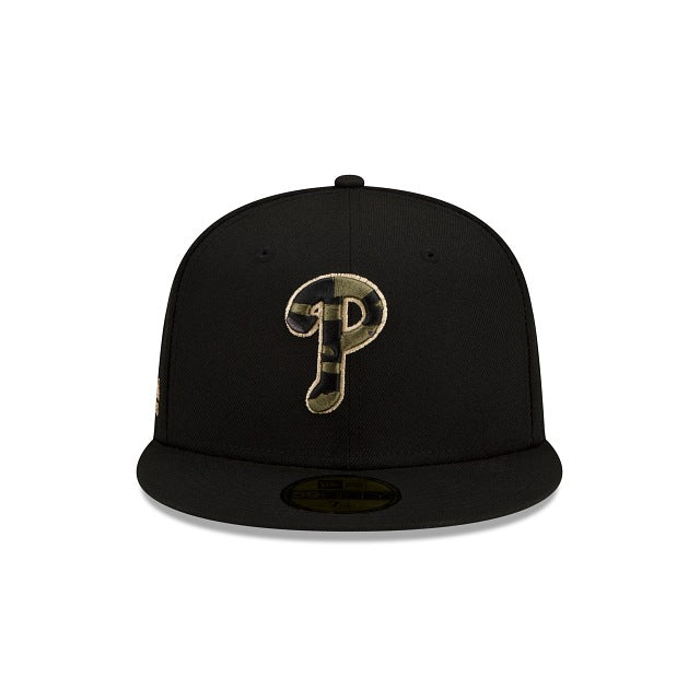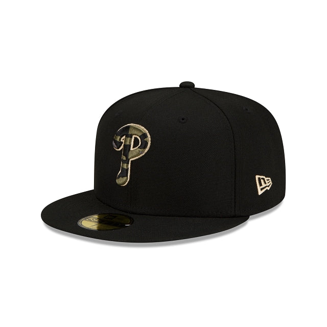 The Philadelphia Phillies Camo Undervisor 59FIFTY Fitted Cap features a camo filled Phillies logo embroidered at the front panels with a team-specific division graphic embroidered at the right-wear side with a matching MLB Batterman logo at the rear. Additional details include a camo undervisor and sweatband.