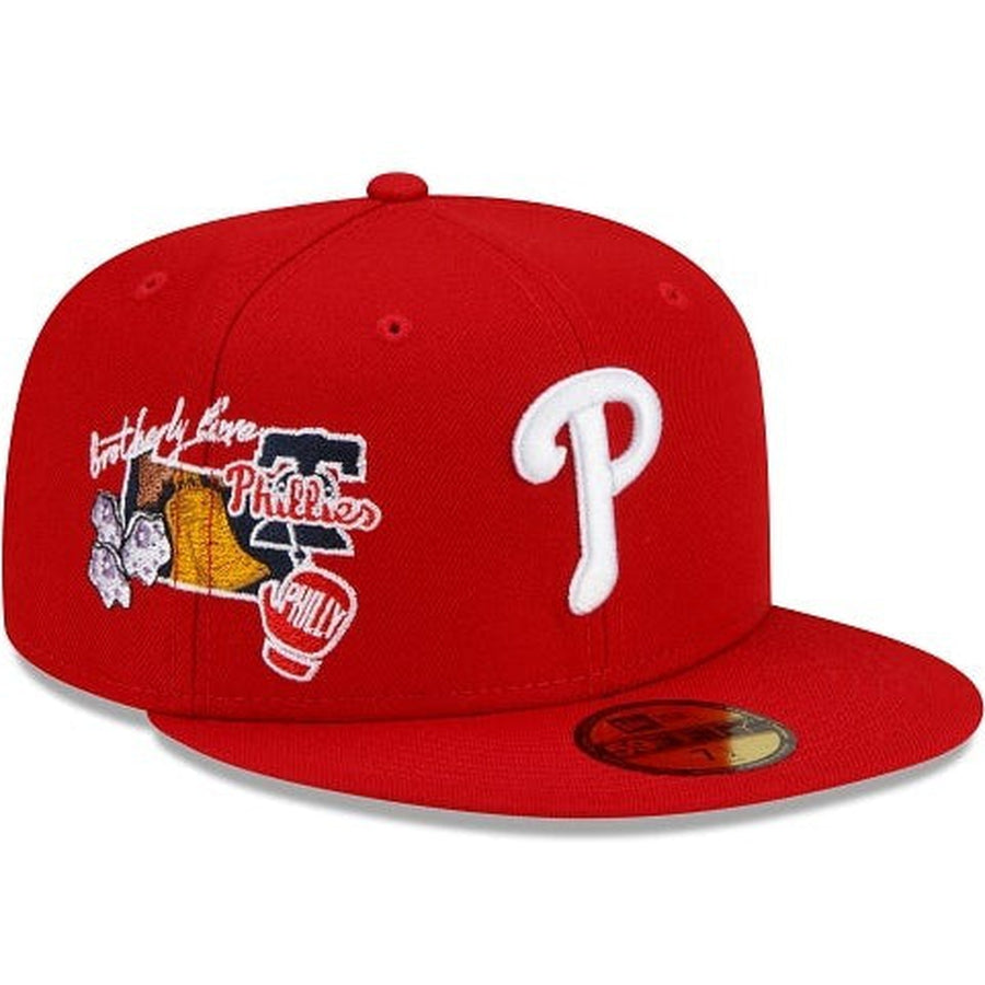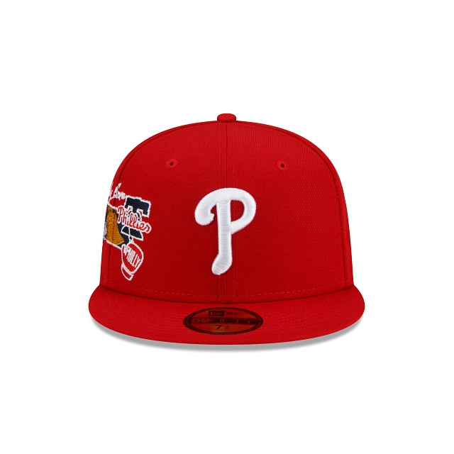 City ties. Represent your team with the Philadelphia Phillies City Cluster 59FIFTY Fitted Cap featuring an embroidered Phillies logo at the front panels with a city inspired patch at the right-wear side and a matching MLB Batterman logo at the rear. Additional details include a gray undervisor.