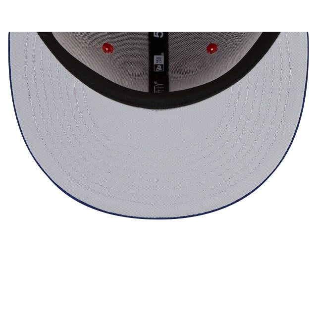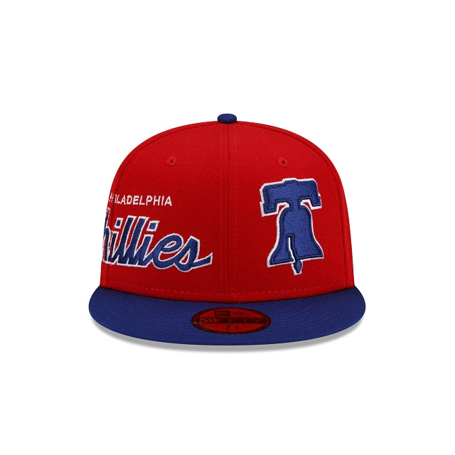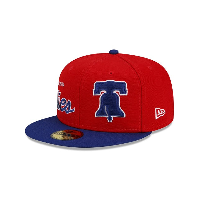 The Philadelphia Phillies Double Logo 59FIFTY Fitted Cap features a two tone team fabrication with an embroidered Phillies logo at the front left-wear panel, complimented by a team script at the right-wear side and a matching MLB Batterman logo at the rear.