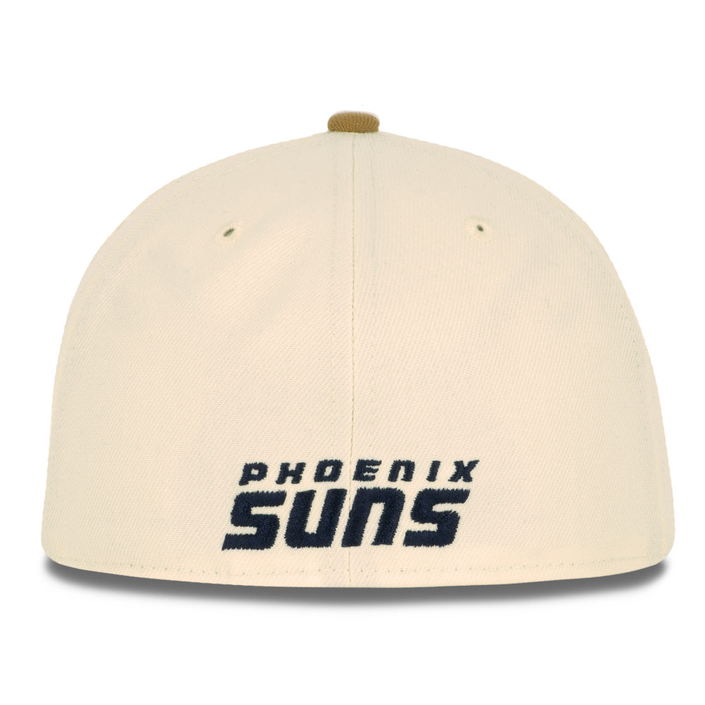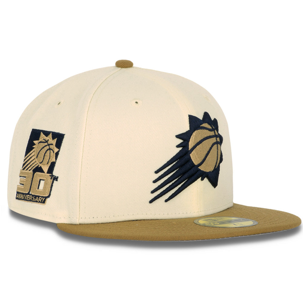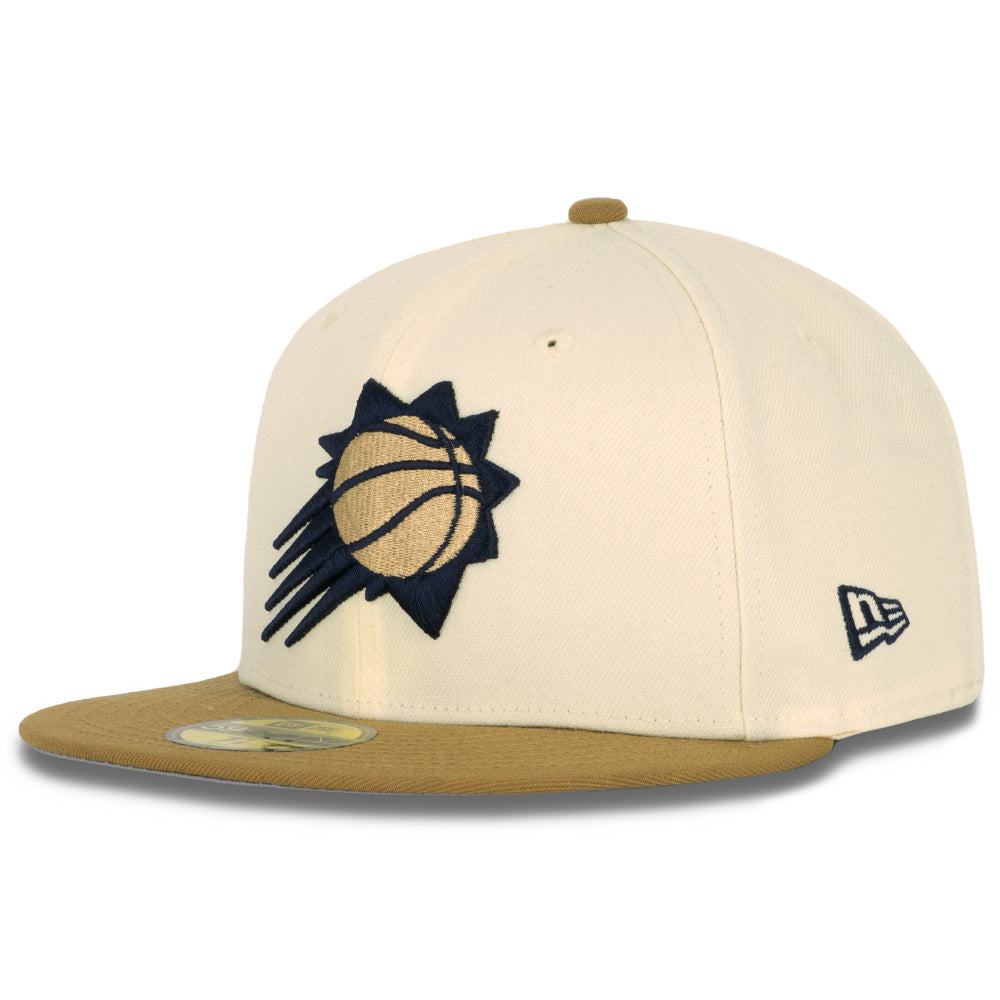 This New Era Phoenix Suns Harvester 2023 59FIFTY Fitted Hat was released by Just Sports. The fitted has a cream six panel structured high crown and embroidered eyelets with a tan fabric squatchee button. The flat bill of the fitted cap is also tan. The front panel features the Phoenix Suns logo embroidered in tan and midnight navy blue stitching. The left panel of the fitted displays the New Era logo and celebratory side patch on the right panel.