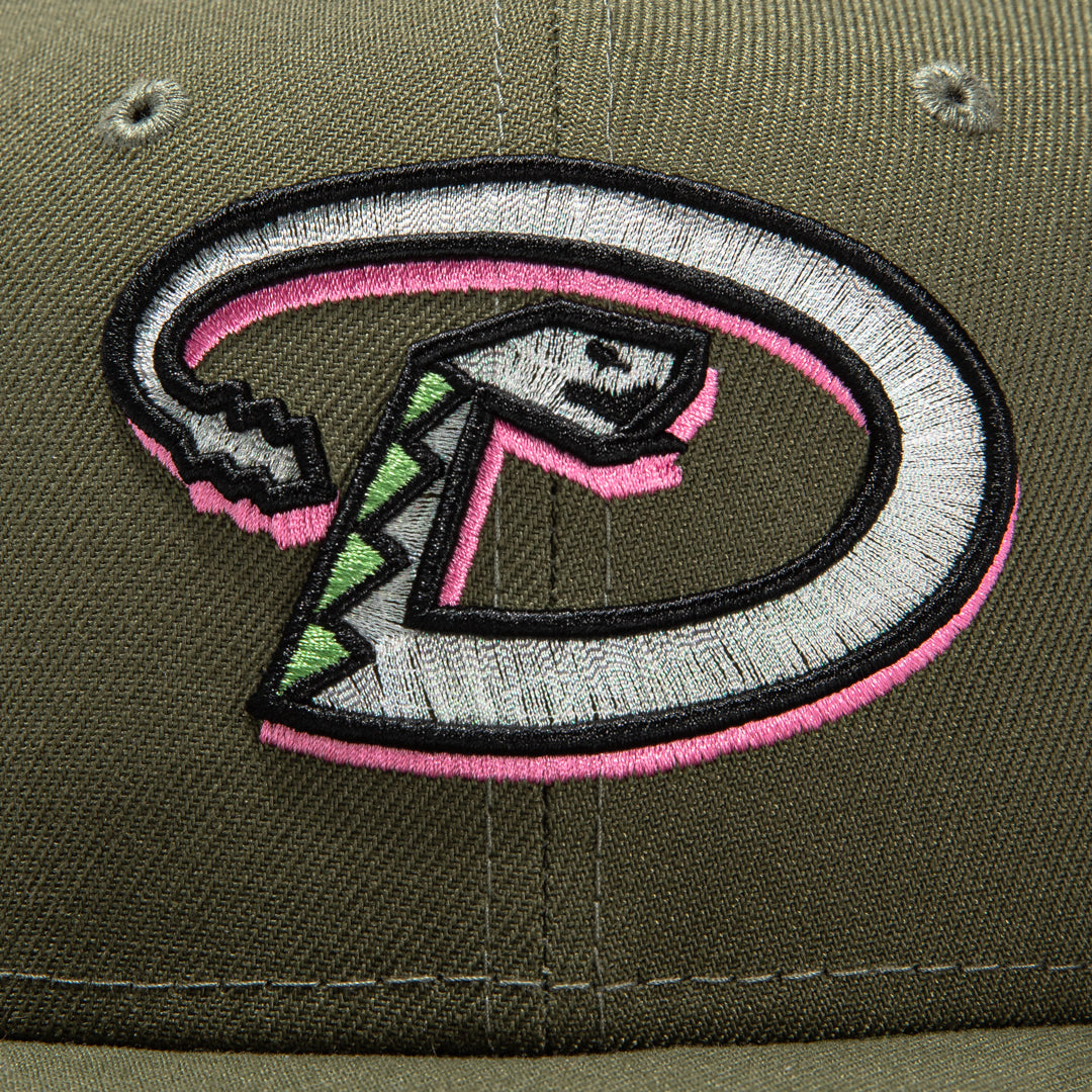 This New Era Arizona Diamondbacks 'Pink Martini' 59FIFTY fitted hat has a olive green six panel structured high crown, olive green embroidered eyelets and an olive green fabric squatchee button. The fitted cap also has a olive green flat bill with a pink undervisor and black sweatband. The front panel features the Arizona Diamondbacks logo embroidery and a side patch embroidery on the right panel. The left panel of the fitted displays the New Era logo and the rear crown features the official MLB logo embroidery.