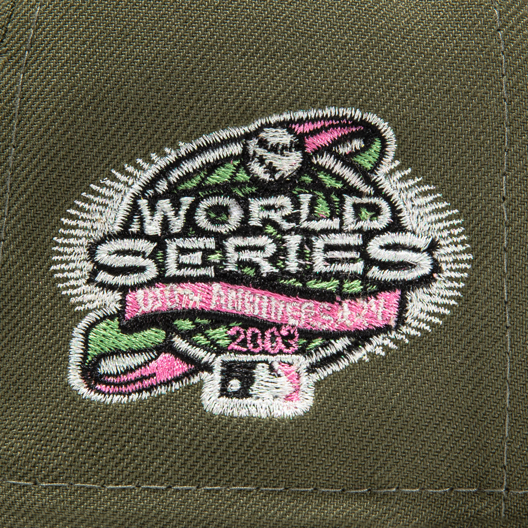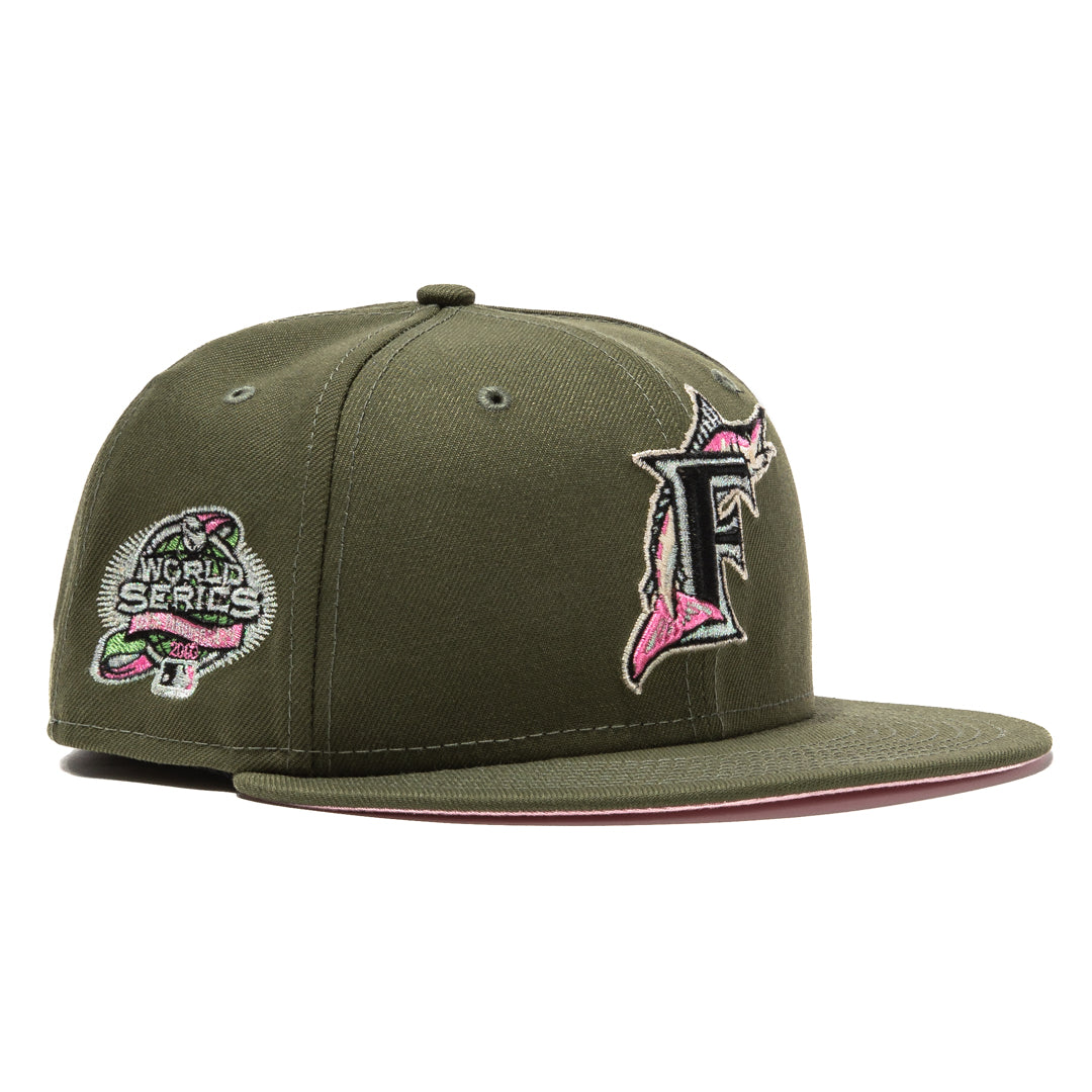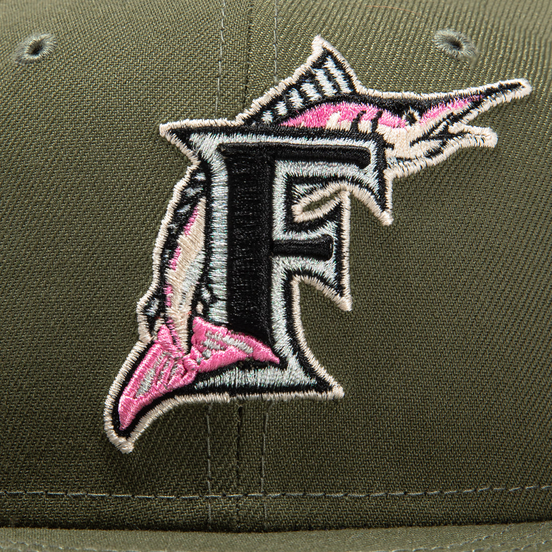 This New Era Florida Marlins 'Pink Martini' 59FIFTY fitted hat has a olive green six panel structured high crown, olive green embroidered eyelets and an olive green fabric squatchee button. The fitted cap also has a olive green flat bill with a pink undervisor and black sweatband. The front panel features the Florida Marlins logo embroidery and a side patch embroidery on the right panel. The left panel of the fitted displays the New Era logo and the rear crown features the official MLB logo embroidery.