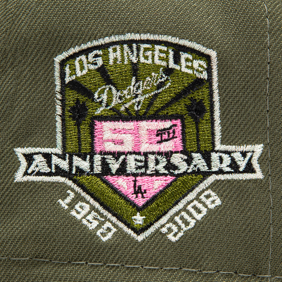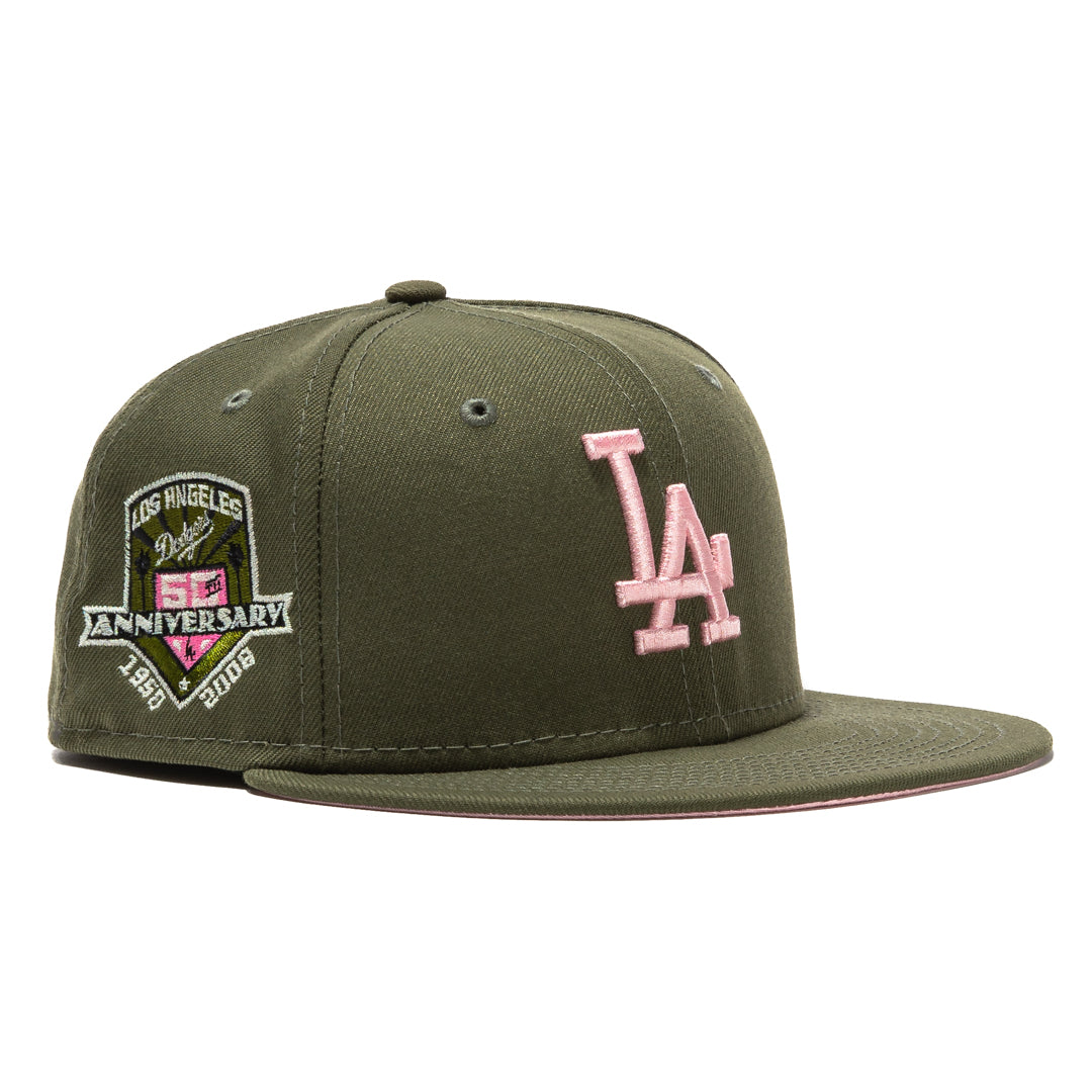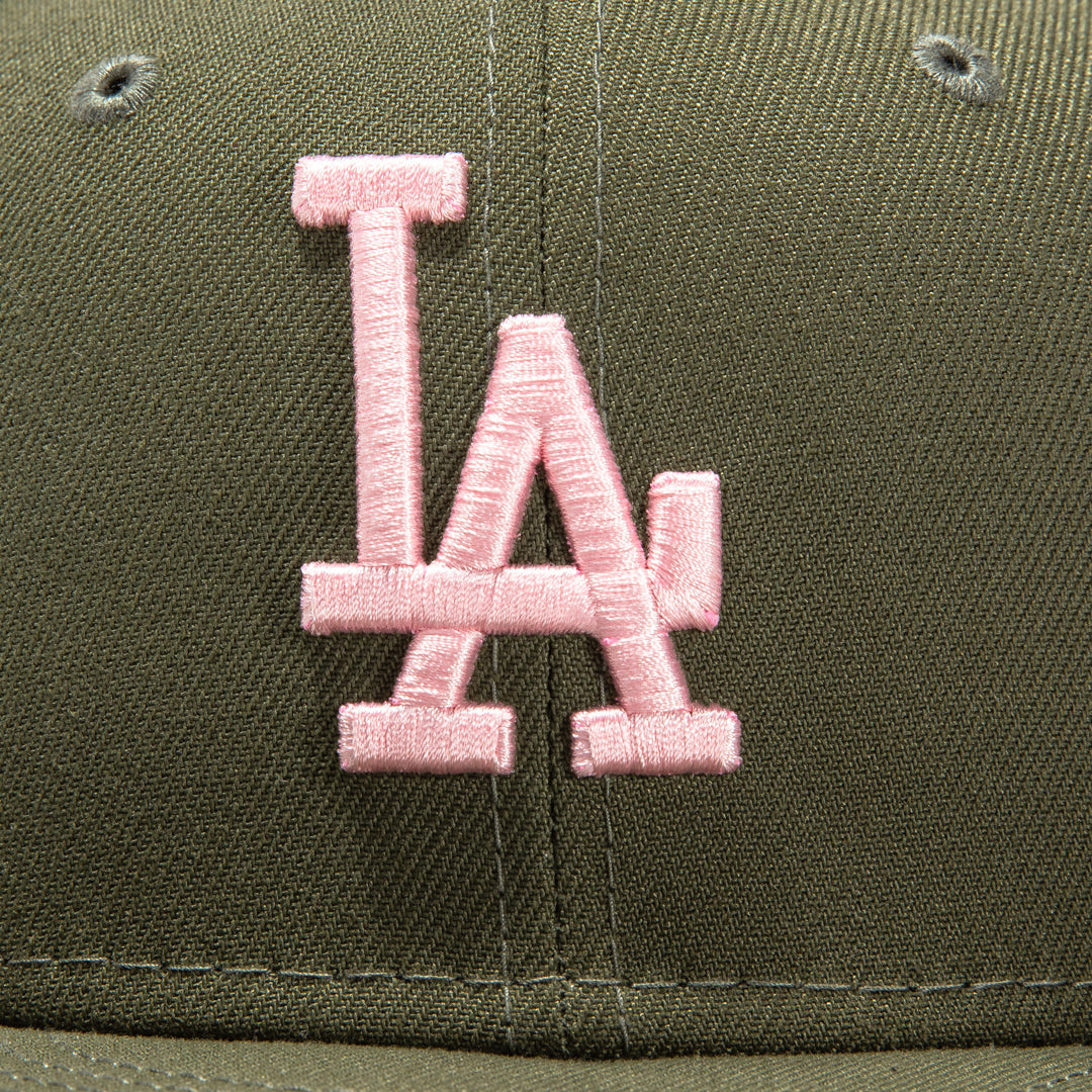 This New Era Los Angeles Dodgers 'Pink Martini' 59FIFTY fitted hat has a olive green six panel structured high crown, olive green embroidered eyelets and an olive green fabric squatchee button. The fitted cap also has a olive green flat bill with a pink undervisor and black sweatband. The front panel features the Los Angeles Dodgers logo embroidery and a side patch embroidery on the right panel. The left panel of the fitted displays the New Era logo and the rear crown features the official MLB logo embroidery.
