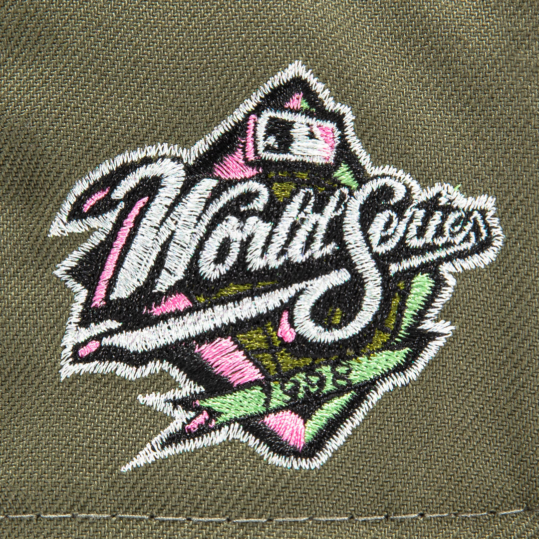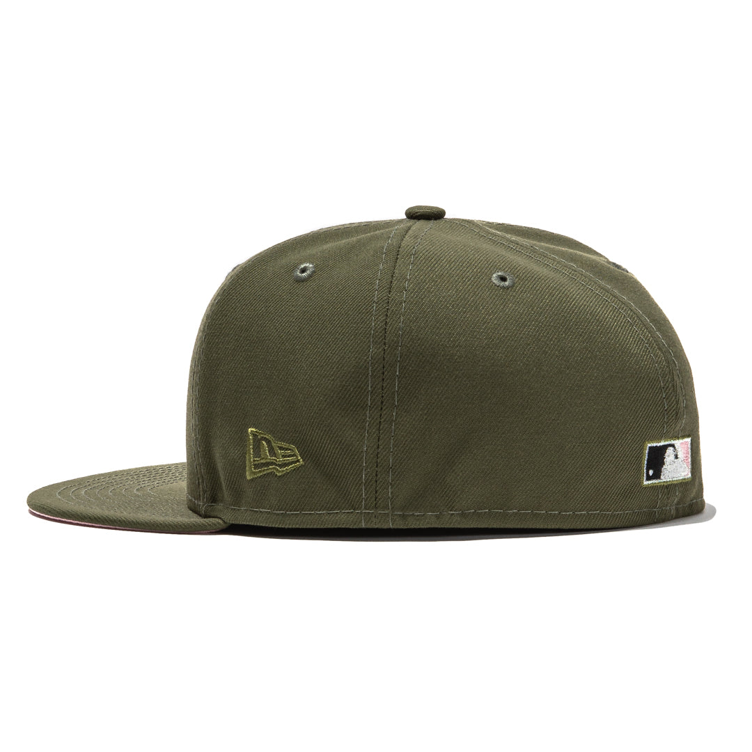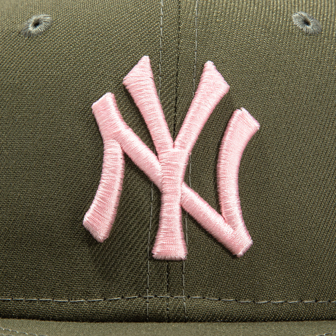 This New Era New York Yankees 'Pink Martini' 59FIFTY fitted hat has a olive green six panel structured high crown, olive green embroidered eyelets and an olive green fabric squatchee button. The fitted cap also has a olive green flat bill with a pink undervisor and black sweatband. The front panel features the New York Yankees logo embroidery and a side patch embroidery on the right panel. The left panel of the fitted displays the New Era logo and the rear crown features the official MLB logo embroidery.