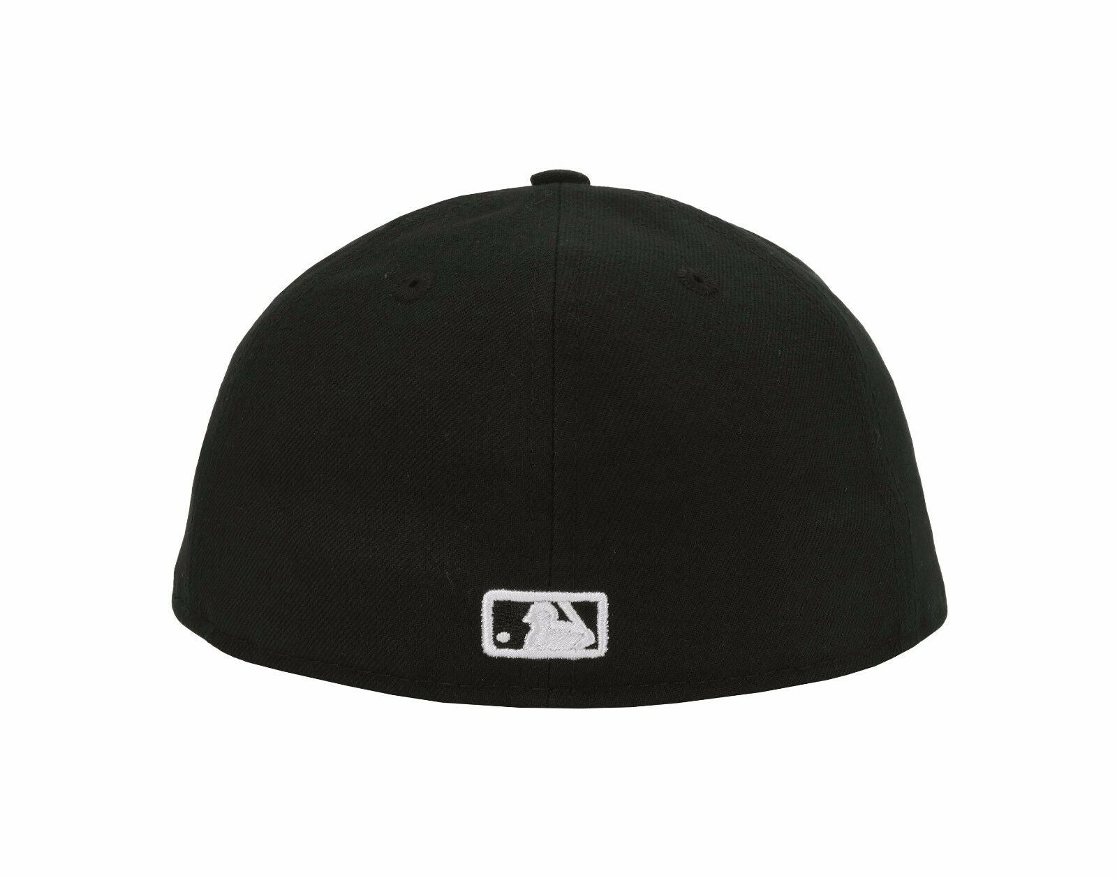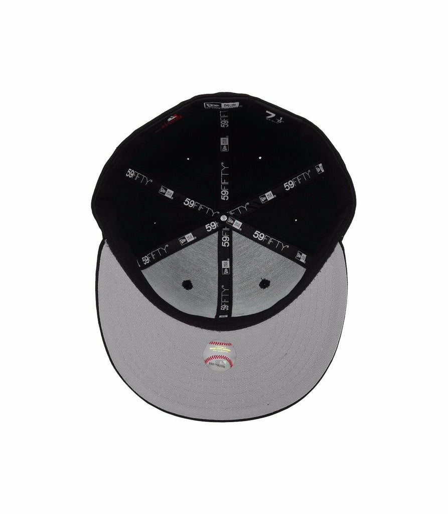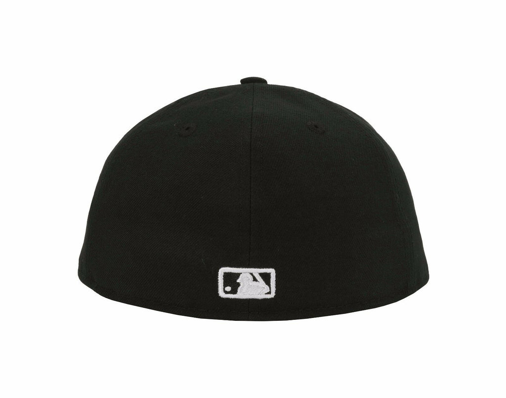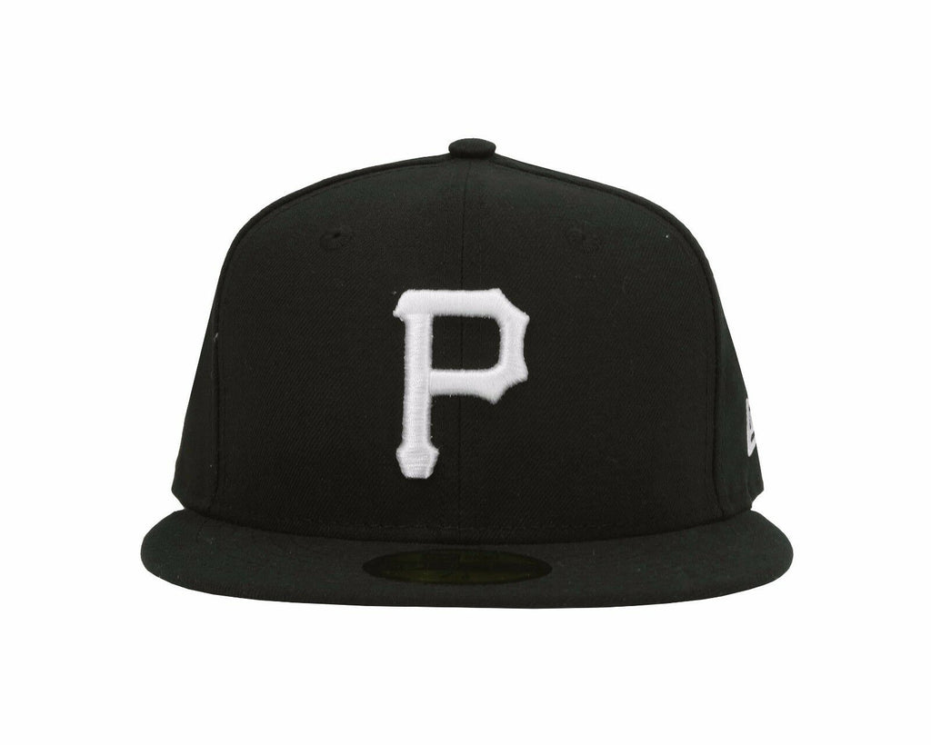 This Pittsburgh Pirates 59FIFTY New Era fitted hat has a black six panel structured high crown and embroidered eyelets with a black fabric squatchee button. The fitted cap also has a black flat bill with a grey undervisor and black sweatband. The front panel features a white embroidered Pittsburgh Pirates logo. The left panel of the fitted displays the New Era logo and the official MLB Batterman logo embroidery on the rear crown.
