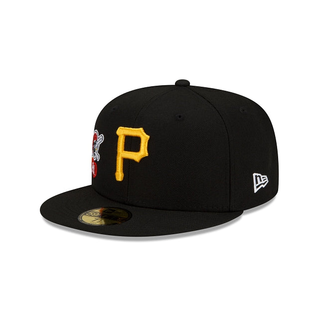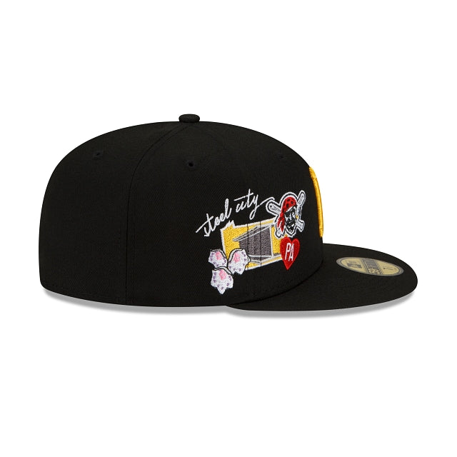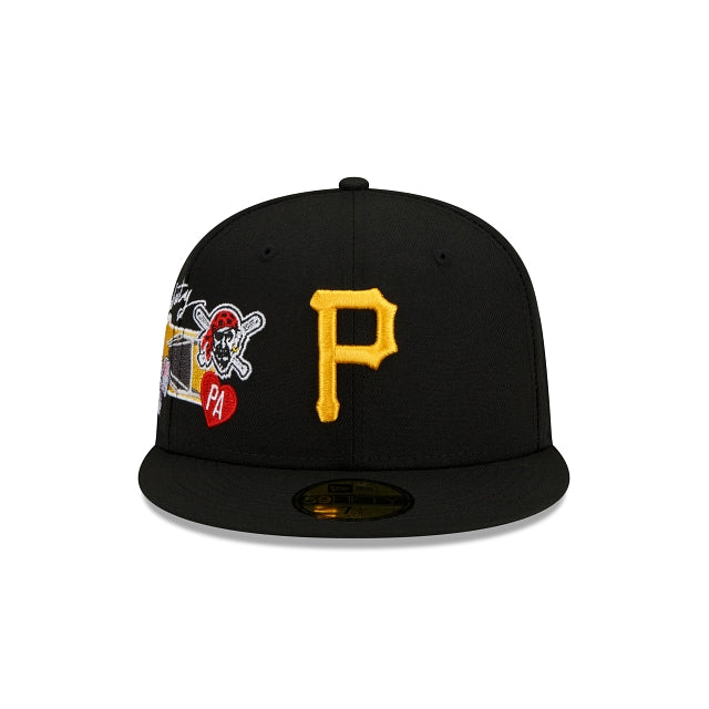 City ties. Represent your team with the Pittsburgh Pirates City Cluster 59FIFTY Fitted Cap featuring an embroidered Pirates logo at the front panels with a city inspired patch at the right-wear side and a matching MLB Batterman logo at the rear. Additional details include a gray undervisor.