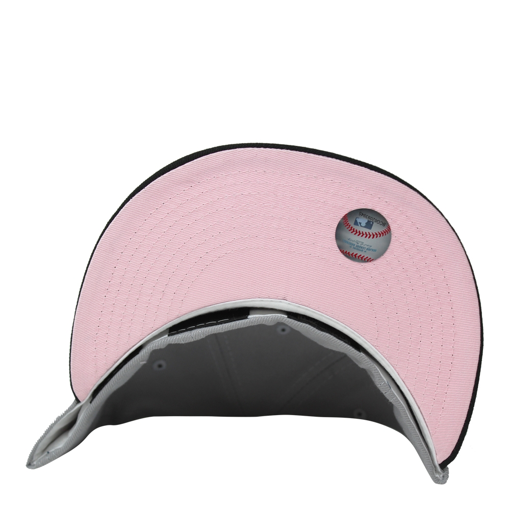 This New Era Pittsburgh Pirates Gray/Black/Purple 1994 All-Star Game 59FIFTY Fitted Hat has a grey six panel structured high crown and embroidered eyelets with a grey fabric squatchee button. The fitted cap has a black flat bill with a soft pink undervisor and black sweatband. The front panel features the Pittsburgh Pirates logo embroidery and a 1994 ASG side patch embroidery on the right panel. The left panel of the fitted displays the New Era logo and the official MLB logo embroidery on the rear crown.