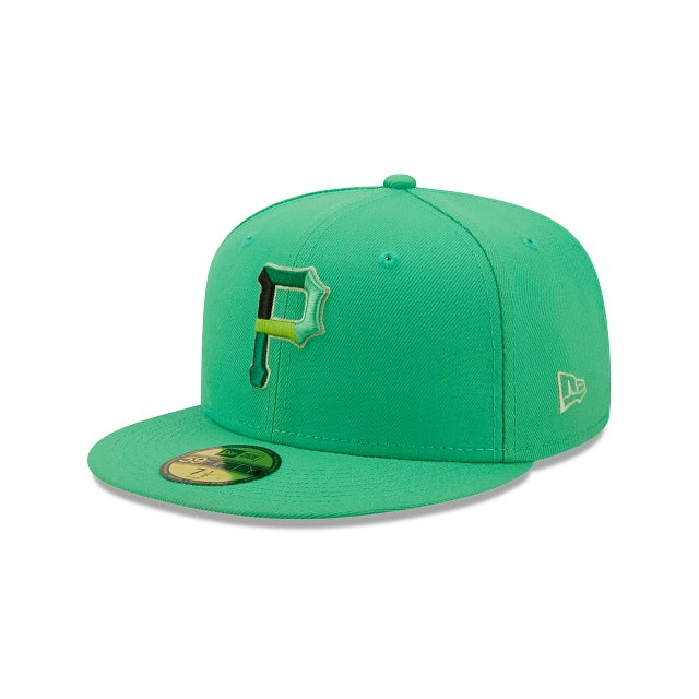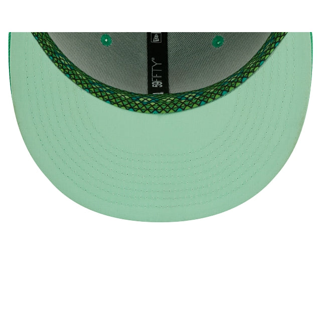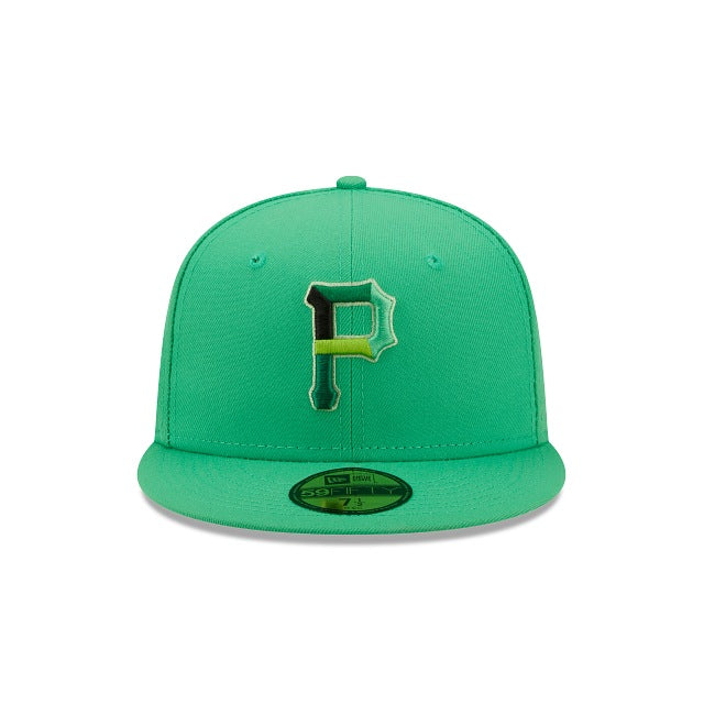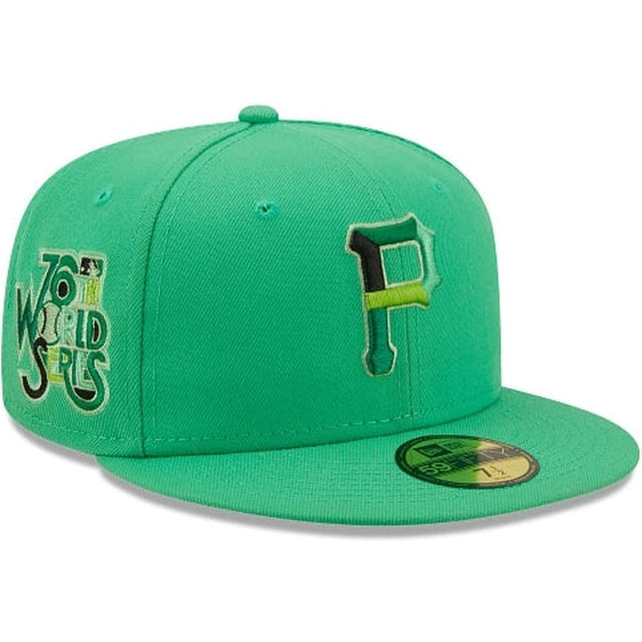 The Pittsburgh Pirates Snakeskin 59FIFTY Fitted Cap features an embroidered Pirates multi-colored logo at the front panels, a 76th World Series patch at the right-wear side, and a matching MLB Batterman logo at the rear. Additional details include a snakeskin inspired inner sweatband and green undervisor.