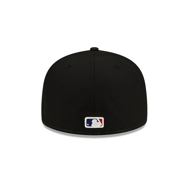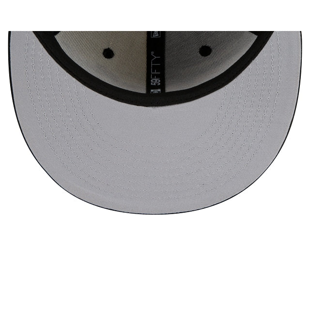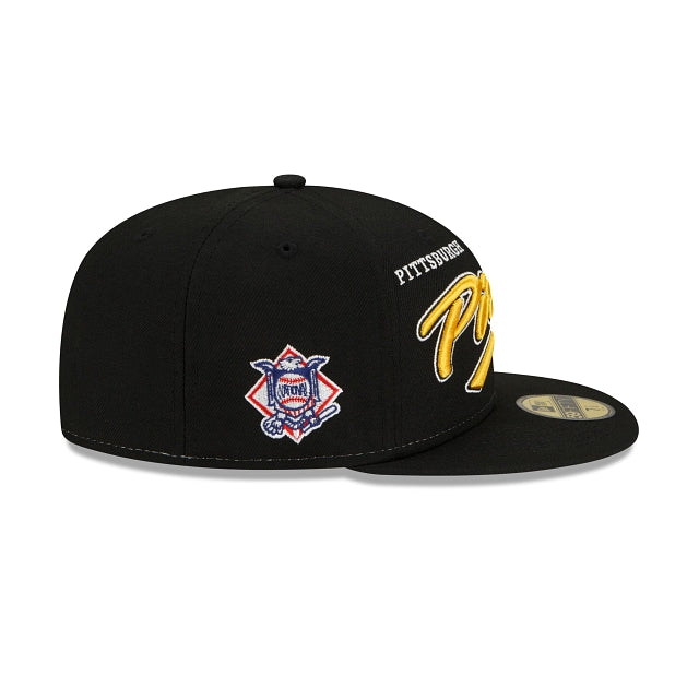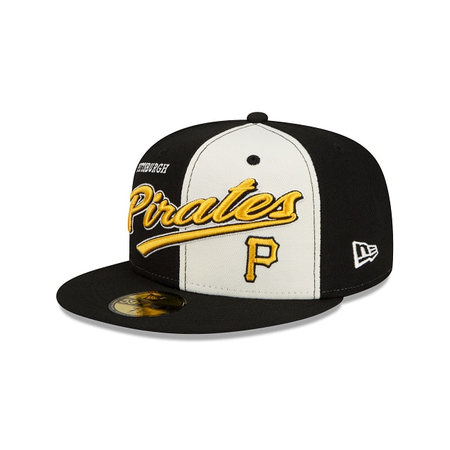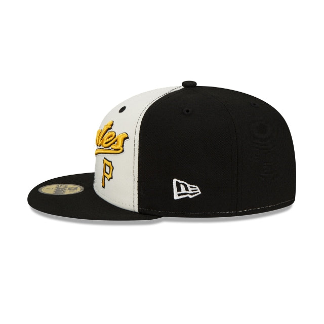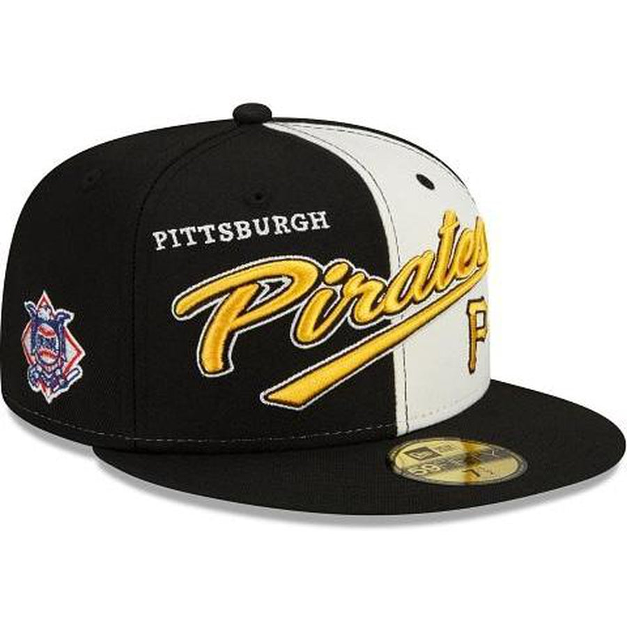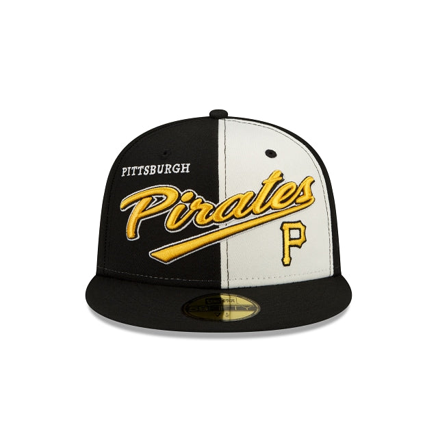 The Pittsburgh Pirates Split Front 59FIFTY Fitted Cap features a two-tone fabrication with an embroidered Pirates script at the front panels with a league specific patch at the right-wear side and the MLB Batterman logo at the rear.