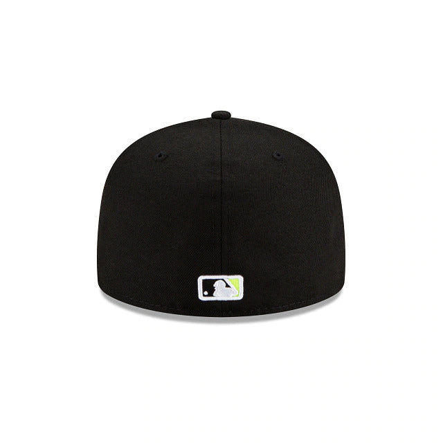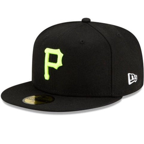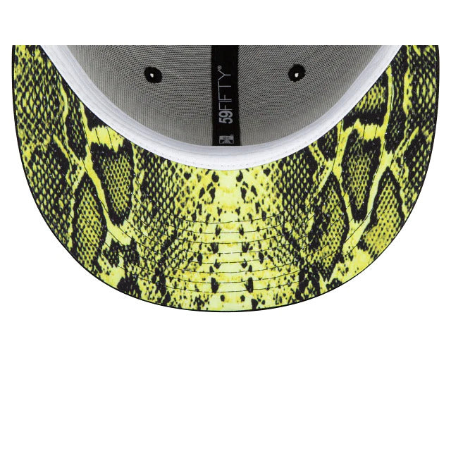 The Pittsburgh Pirates Summer Pop 59FIFTY Fitted Cap features a neon Pirates logo embroidered at the front panels with a World Series patch at the right-wear side and a matching MLB Batterman logo at the rear. Additional details include a snakeskin print undervisor.