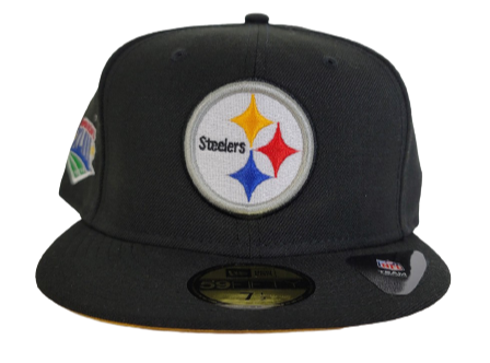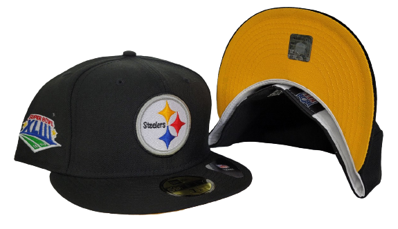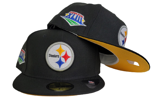 This New Era Pittsburgh Steelers Super Bowl XLIII fitted hat features a black six panel structured high crown, embroidered eyelets and fabric squatchee button. The flat bill of the fitted is also black with a yellow undervisor and white sweatband. The front panel features the NFL team Pittsburgh Steelers logo with a Super Bowl XLIII side patch on the right side.