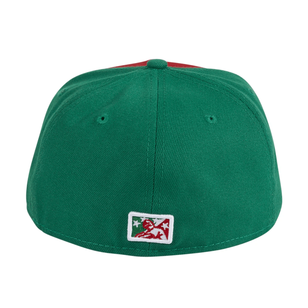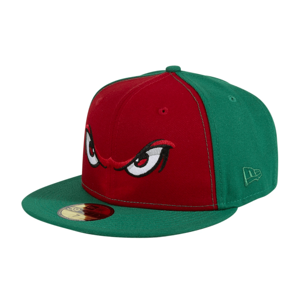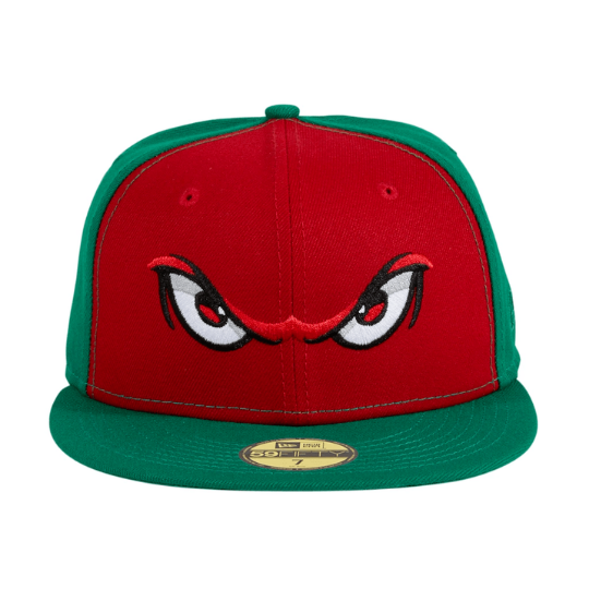 This fitted hat was made to look like the Ninja Turtle Raphael! The New Era 59Fifty Lake Elsinore Storm Rail (Red) Fitted Hat has a mixture of Kelly green and red high structure crown. The back 4 panels is Kelly green and the 2 front panels are red. The front logo has the trademark Lake Elsinore Storm Rail angry eyes. The iconic New Era logo located on the left side of the fitted hat is embroidered in Kelly green thread and on the back of the fitted is the official MILB badge embroidered in red and white thread.