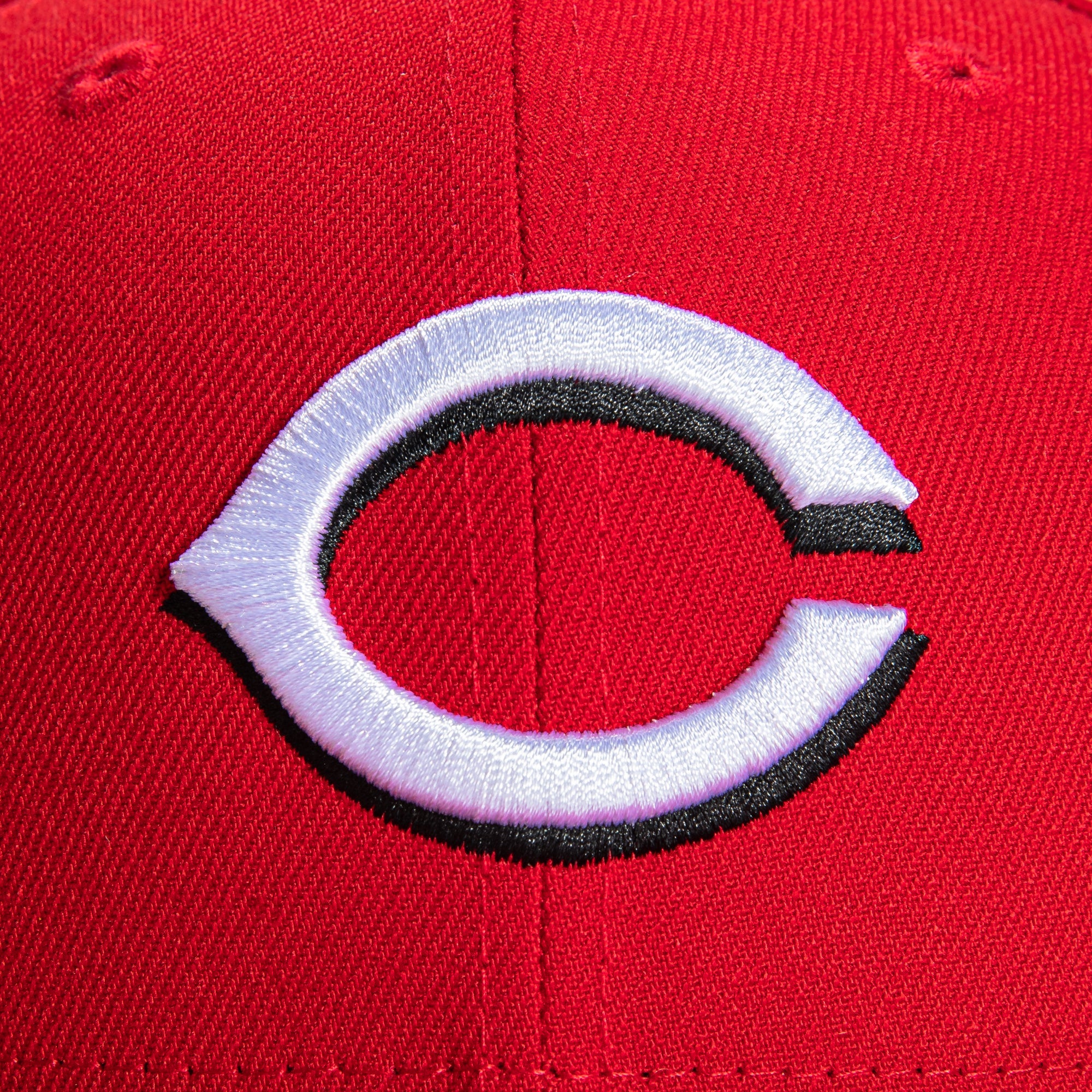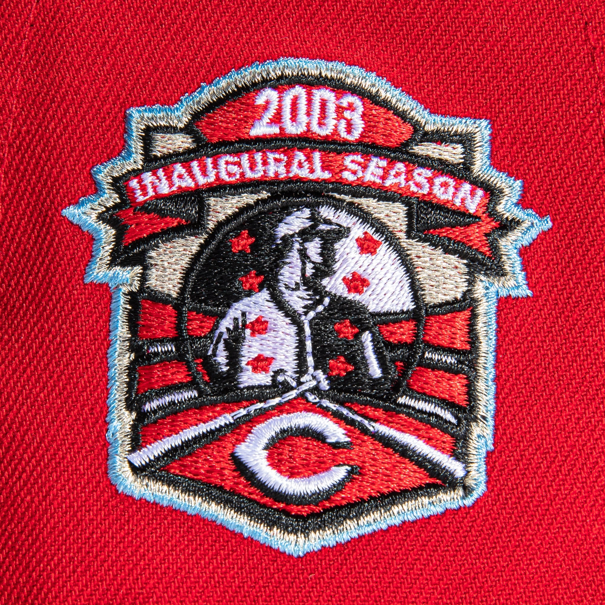 This New Era Red Icy Cincinnati Reds 2003 Inaugural 59FIFTY Fitted Hat was released by Hat Club. The fitted has a red six panel structured high crown, embroidered eyelets with and fabric squatchee button. The fitted also has a red flat bill with an "icy" (light blue) undervisor. The front panel features the Cincinnati Reds logo embroidery and a side patch embroidery on the right panel. The left panel of the fitted displays the New Era logo and the official MLB logo embroidery on the rear crown.