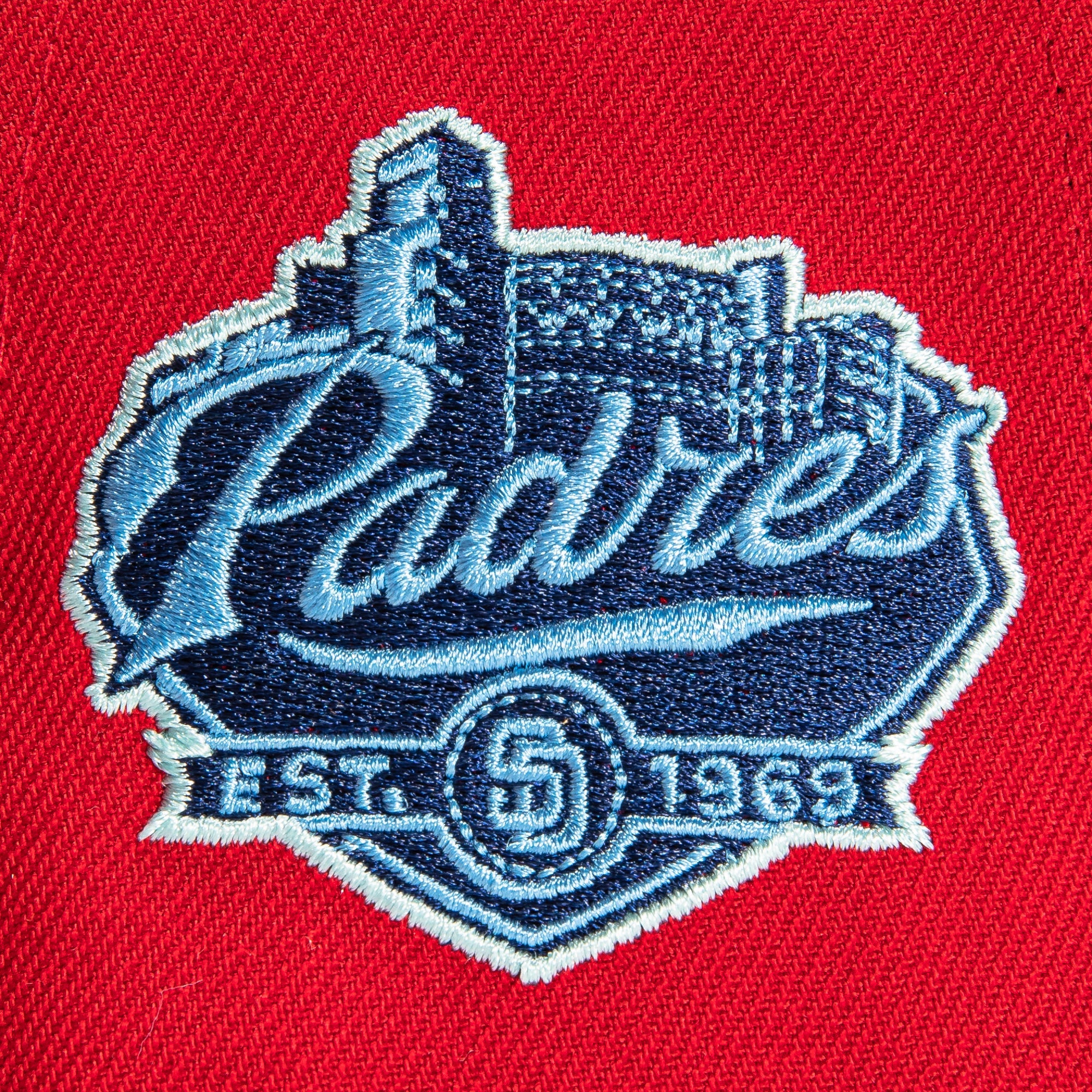 This New Era Red Icy San Diego Padres Stadium 59FIFTY Fitted Hat was released by Hat Club. The fitted has a red six panel structured high crown, embroidered eyelets with and fabric squatchee button. The fitted also has a red flat bill with an "icy" (light blue) undervisor. The front panel features the San Diego Padres logo embroidery and a side patch embroidery on the right panel. The left panel of the fitted displays the New Era logo and the official MLB logo embroidery on the rear crown.