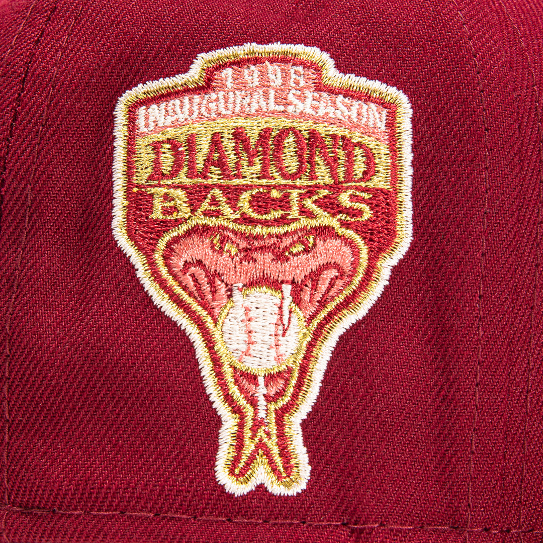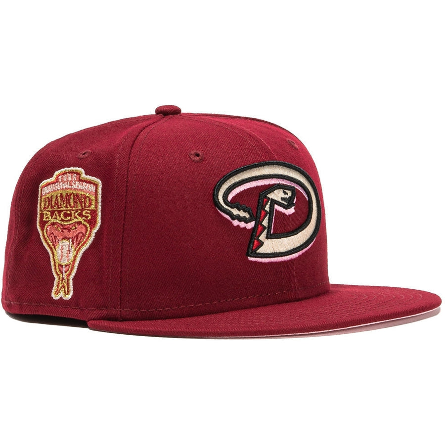 This New Era Arizona Diamondbacks 59FIFTY fitted hat has a Cardinal Red six panel structured high crown, Cardinal Red embroidered eyelets and a Cardinal Red fabric squatchee button. The fitted cap also has a Cardinal Red flat bill with a pink undervisor and black sweatband. The front panel features the Arizona Diamondbacks logo embroidery and a side patch embroidery on the right panel. The left panel of the fitted displays the New Era logo and the rear crown features the official MLB logo embroidery.