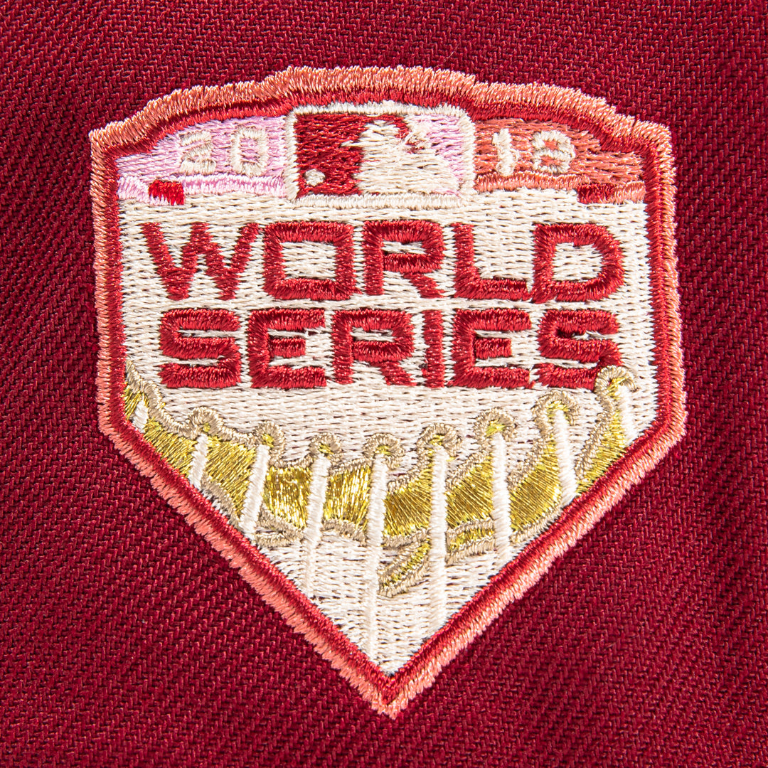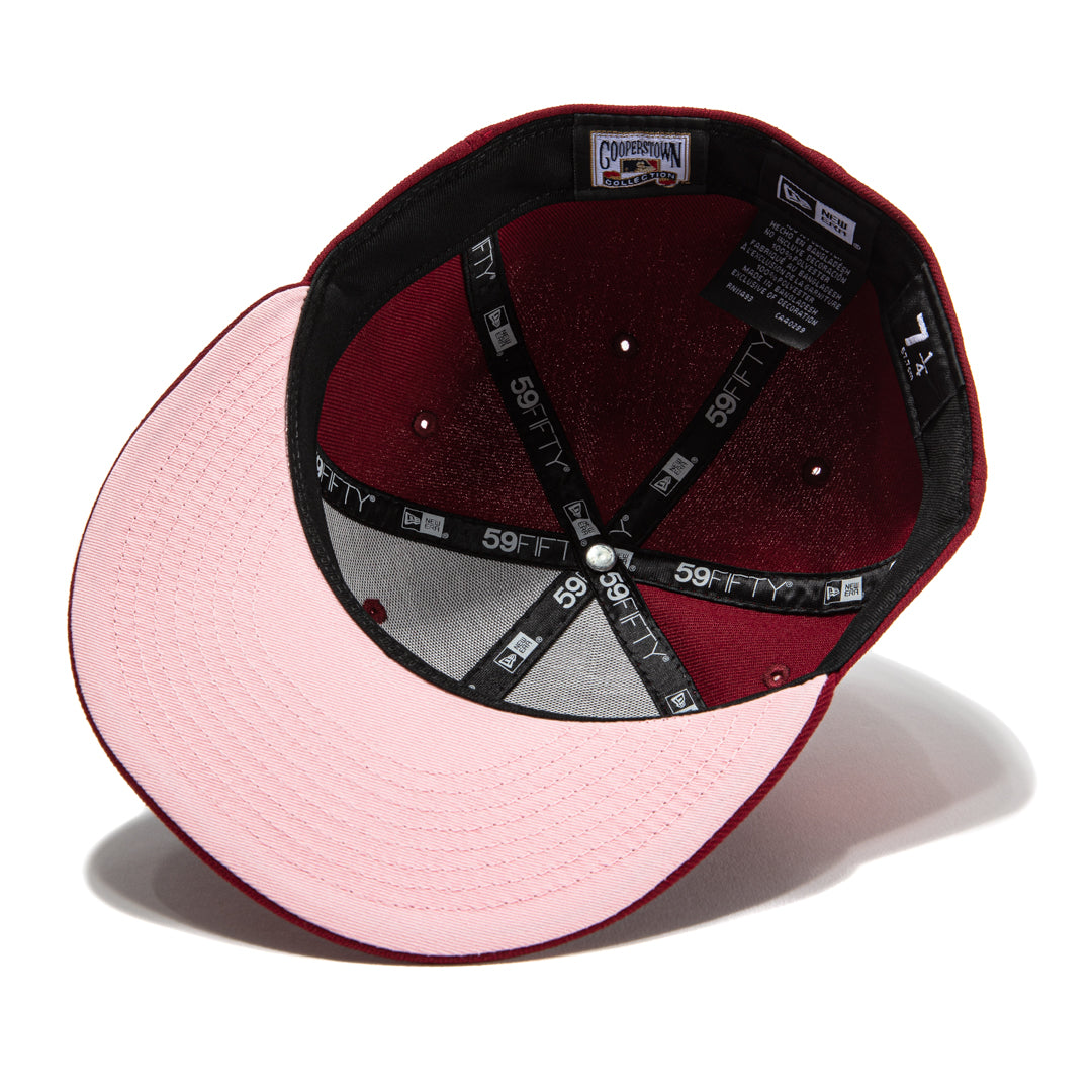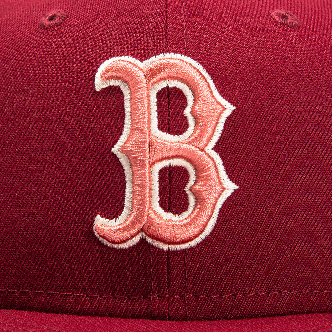This New Era Boston Red Sox 59FIFTY fitted hat has a Cardinal Red six panel structured high crown, Cardinal Red embroidered eyelets and a Cardinal Red fabric squatchee button. The fitted cap also has a Cardinal Red flat bill with a pink undervisor and black sweatband. The front panel features the Boston Red Sox logo embroidery and a side patch embroidery on the right panel. The left panel of the fitted displays the New Era logo and the rear crown features the official MLB logo embroidery.