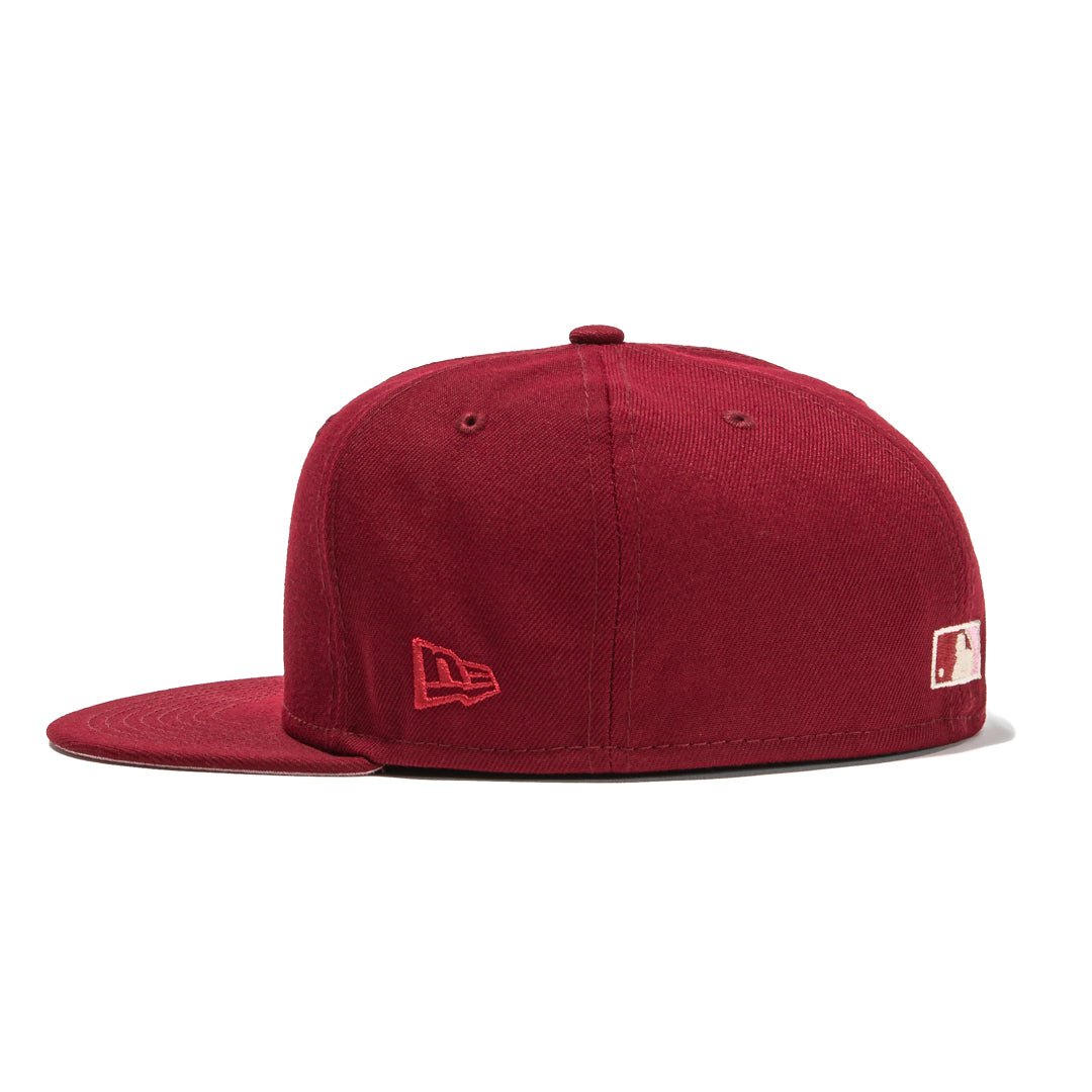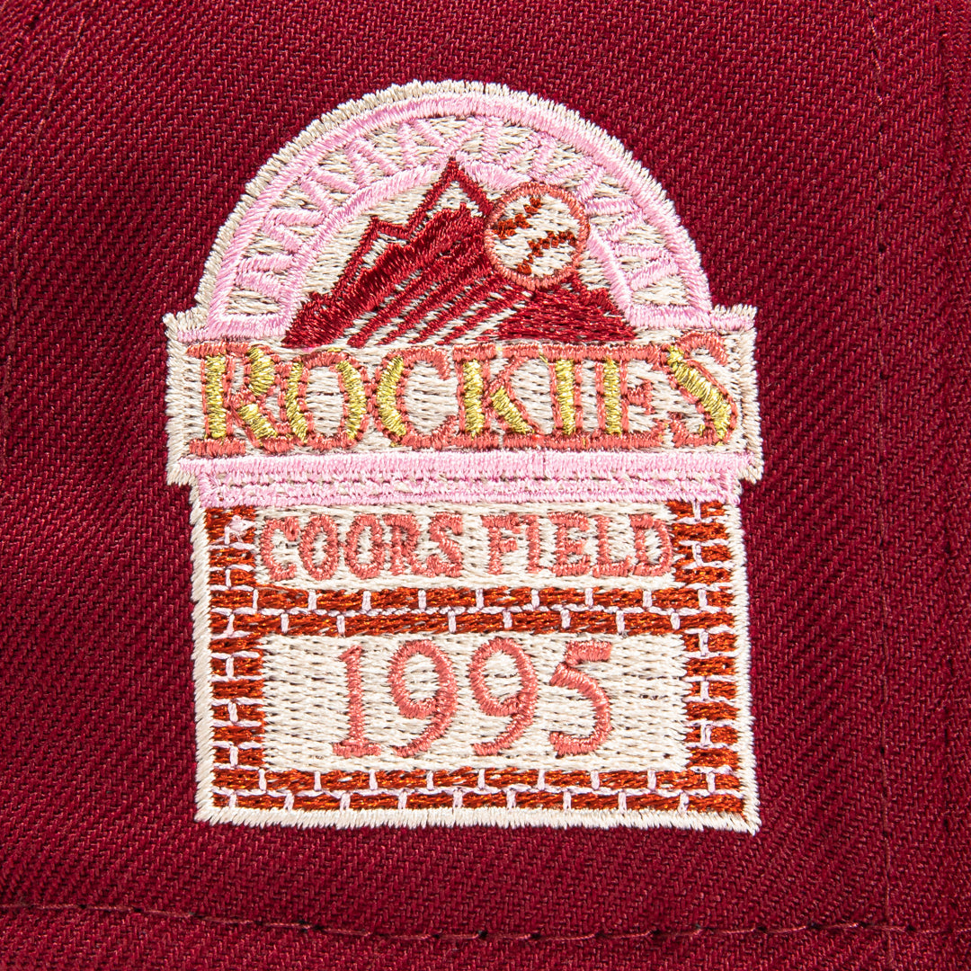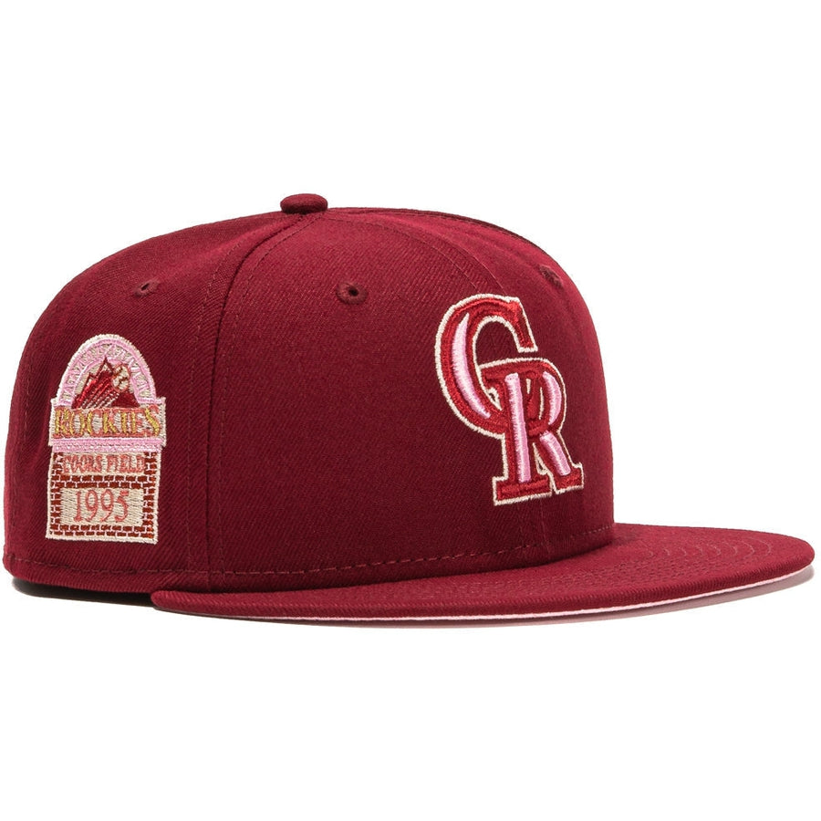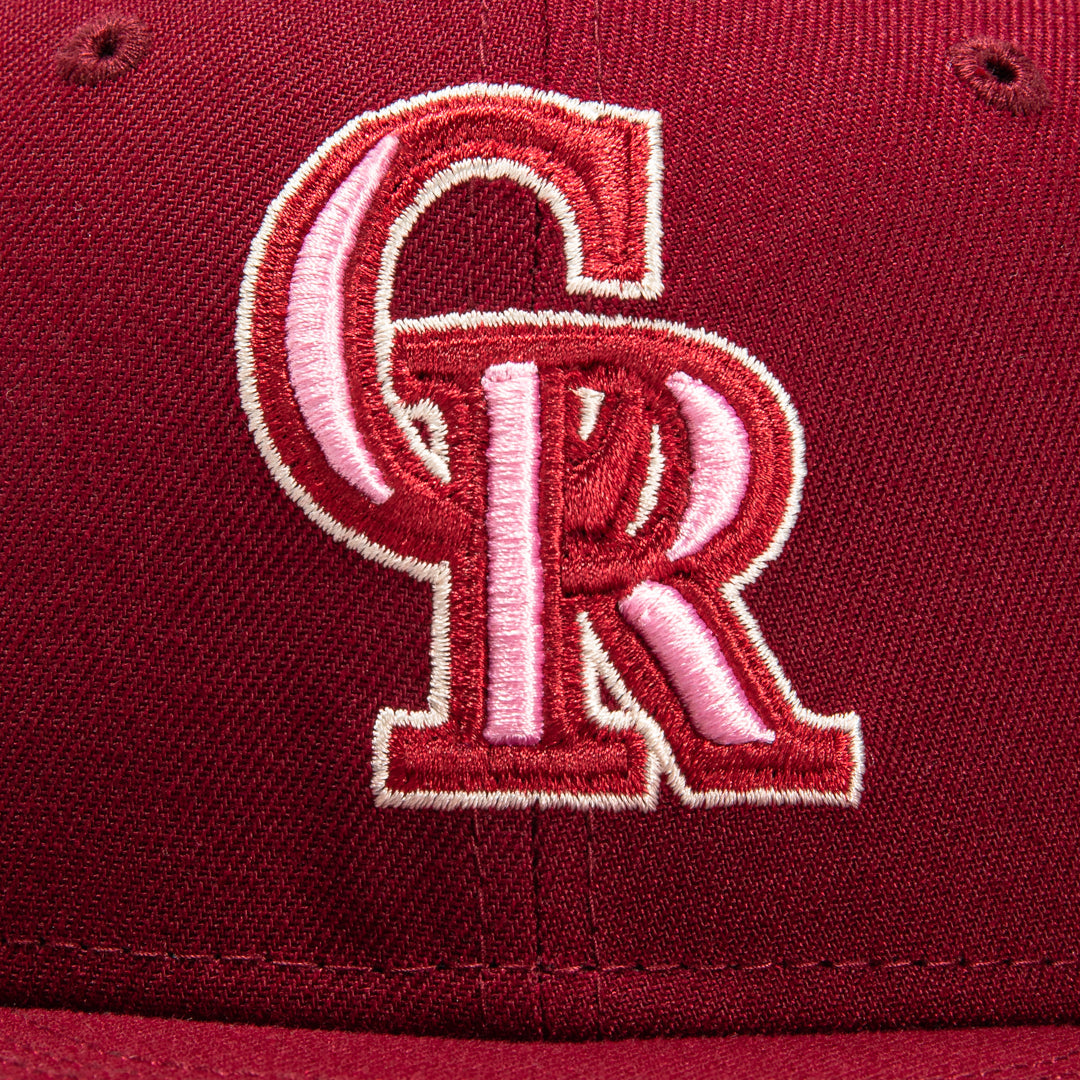 This New Era Colorado Rockies 59FIFTY fitted hat has a Cardinal Red six panel structured high crown, Cardinal Red embroidered eyelets and a Cardinal Red fabric squatchee button. The fitted cap also has a Cardinal Red flat bill with a pink undervisor and black sweatband. The front panel features the Colorado Rockies logo embroidery and a side patch embroidery on the right panel. The left panel of the fitted displays the New Era logo and the rear crown features the official MLB logo embroidery.