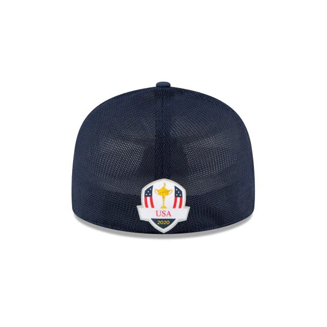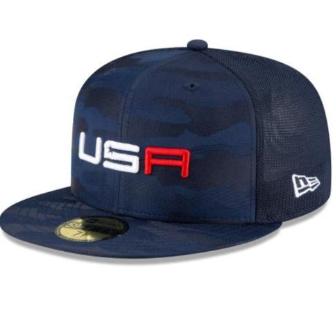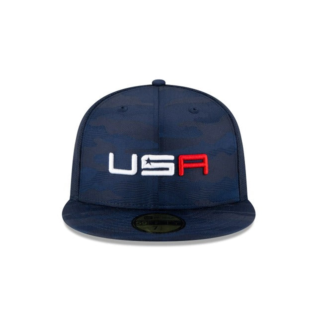The Ryder Cup Saturday Navy Camo 59FIFTY Fitted Cap features a navy camouflage pattern with USA embroidery at the front panels, mesh mid and rear panels and the 2020 Ryder Cup Shield at the rear.
