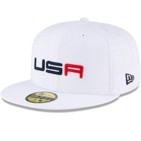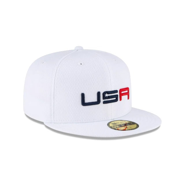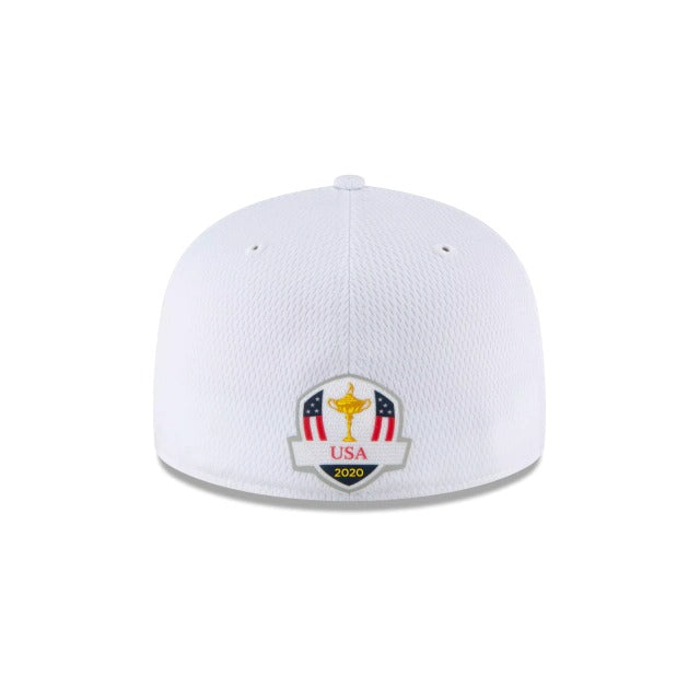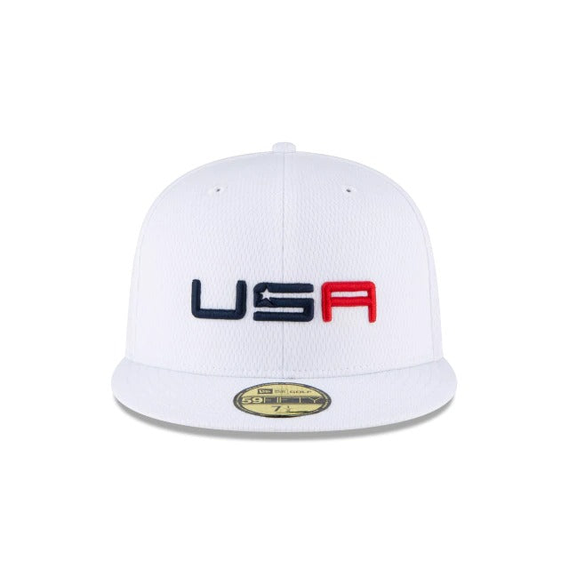 The Ryder Cup Thursday Practice White 59FIFTY Fitted Cap features USA embroidered at the front panels and the 2020 Ryder Cup Shield at the rear.