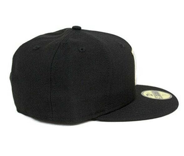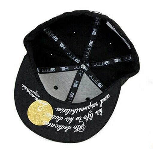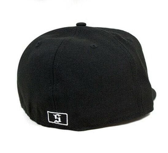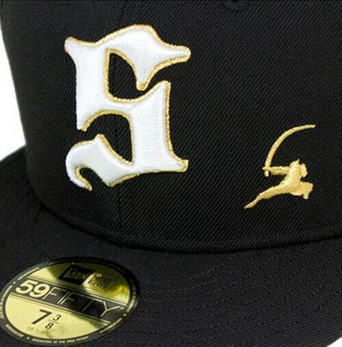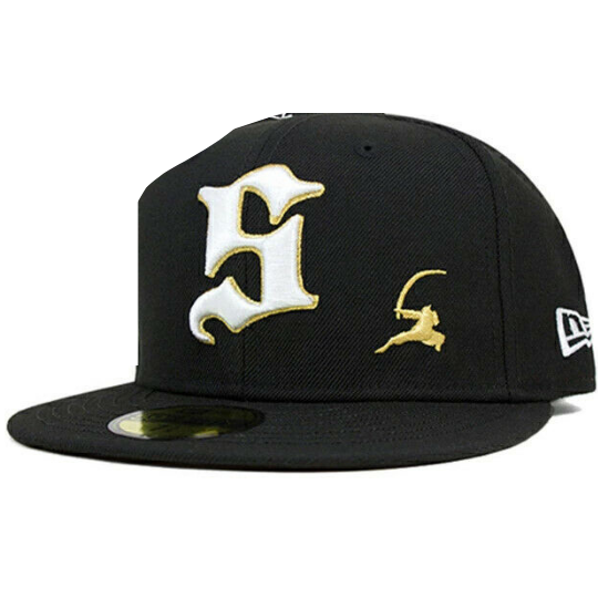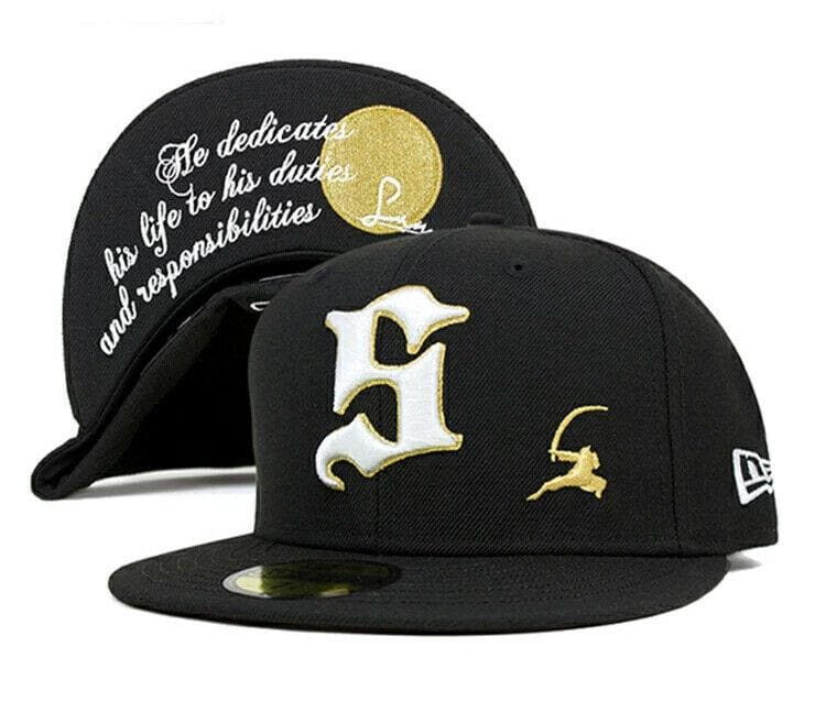 The New Era Samurai 59Fifty fitted hat has a black, white and gold colorway. The high structured crown, fabric squatchee button and embroidered eyelets are black. The flat brim is also black in color. This fitted has a black nasty undervisor with a gold circular badge and white cursive script. The front logo display an white threaded "S" outlined in gold. "S" is for Samurai. To the left of the "S" logo is a gold embroidery of a shadow Samurai figure.