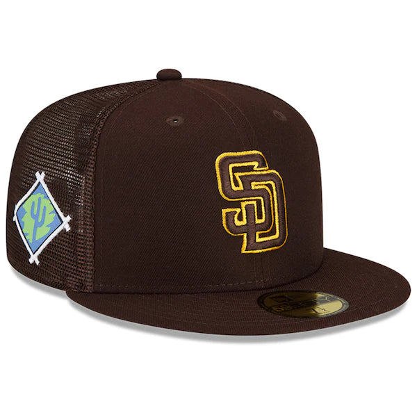 Get ready to start the MLB 2022 regular season in true San Diego Padres style with this Spring Training 59FIFTY fitted hat from New Era. Along with a high crown and structured fit for a street-ready look, the mesh back allows for more breathability. Best of all, the spirited San Diego Padres embroidery on the front and the bold applique on the side further show off your excitement for the upcoming season.