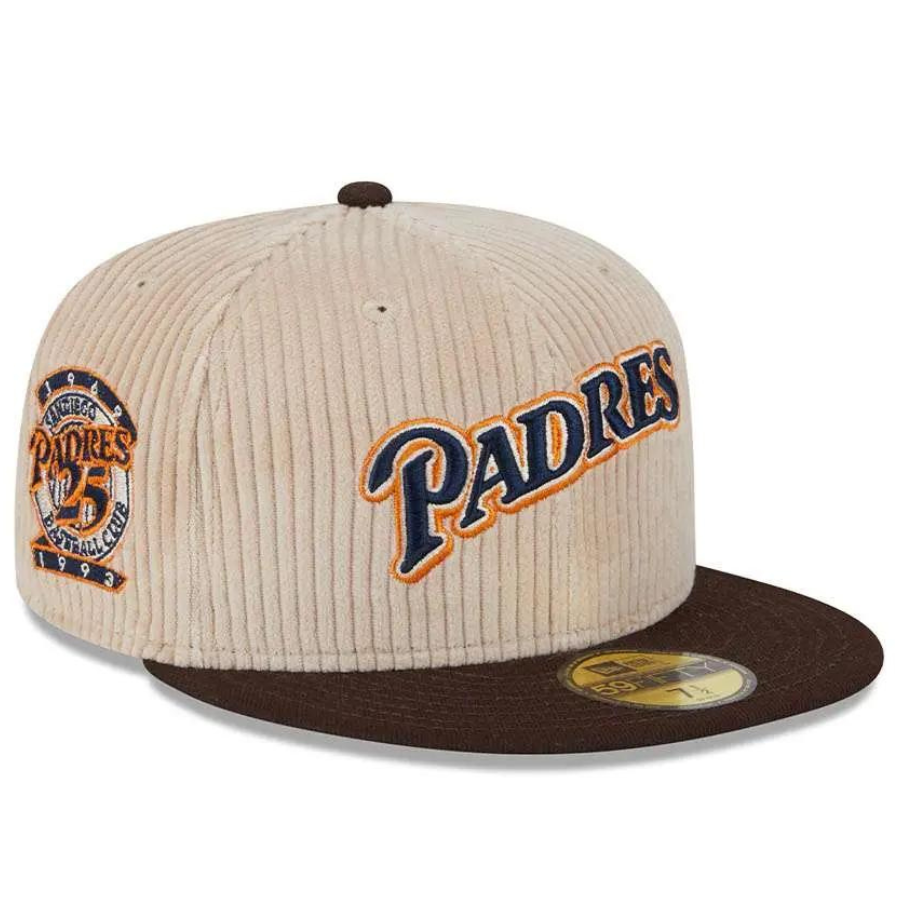 This San Diego Padres fitted hat was released by Topperz Store. The fitted has a tan corduroy six panel structured high crown and embroidered eyelets with a dark brown fabric squatchee button. The fitted cap also has a dark brown flat bill with a green bottom undervisor and black sweatband. The front panel features the San Diego Padres logo embroidery and a 25th Anniversary side patch embroidery on the right panel. The left panel of the fitted displays the New Era logo and the official MLB Batterman logo embroidery on the rear crown.