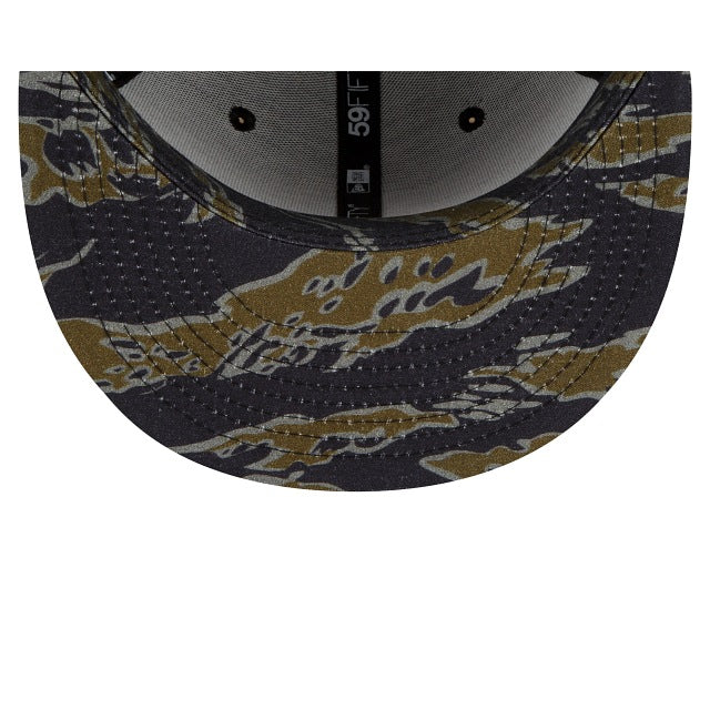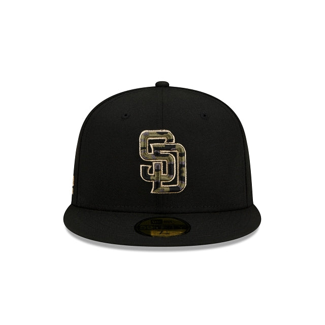 The San Diego Padres Camo Undervisor 59FIFTY Fitted Cap features a camo filled Padres logo embroidered at the front panels with a team-specific division graphic embroidered at the right-wear side with a matching MLB Batterman logo at the rear. Additional details include a camo undervisor and sweatband.