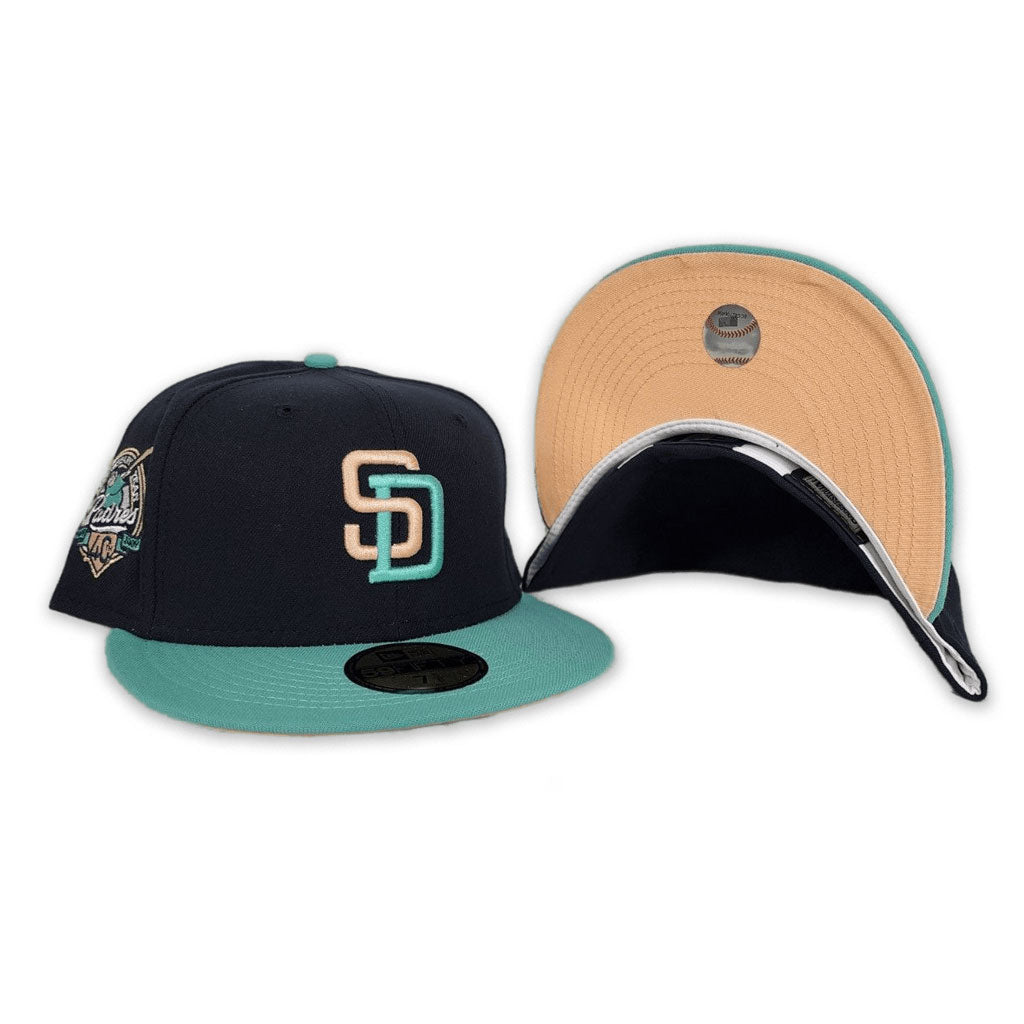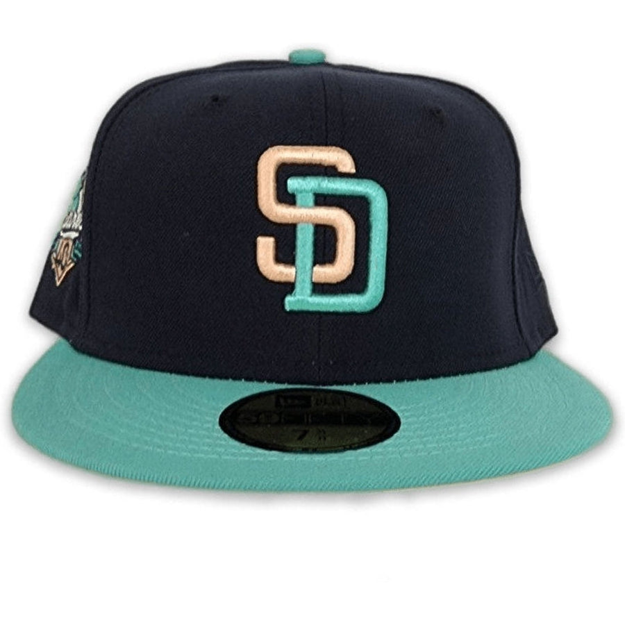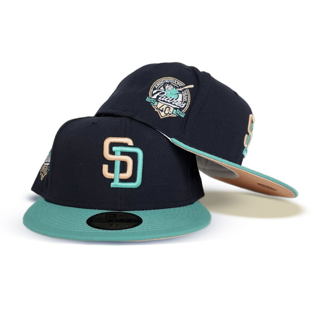 This New Era San Diego Padres Navy/Mint 40th Anniversary Side Patch New Era 59FIFTY Fitted Hat has a navy blue six panel structured high crown and embroidered eyelets with a mint fabric squatchee button. The fitted cap has a mint flat bill with a peach undervisor and white sweatband. The front panel features the San Diego Padres logo embroidery and a 40th Anniversary side patch embroidery on the right panel. The left panel of the fitted displays the New Era logo and the official MLB logo embroidery on the rear crown.