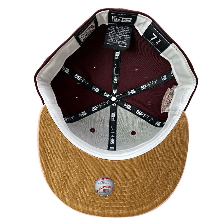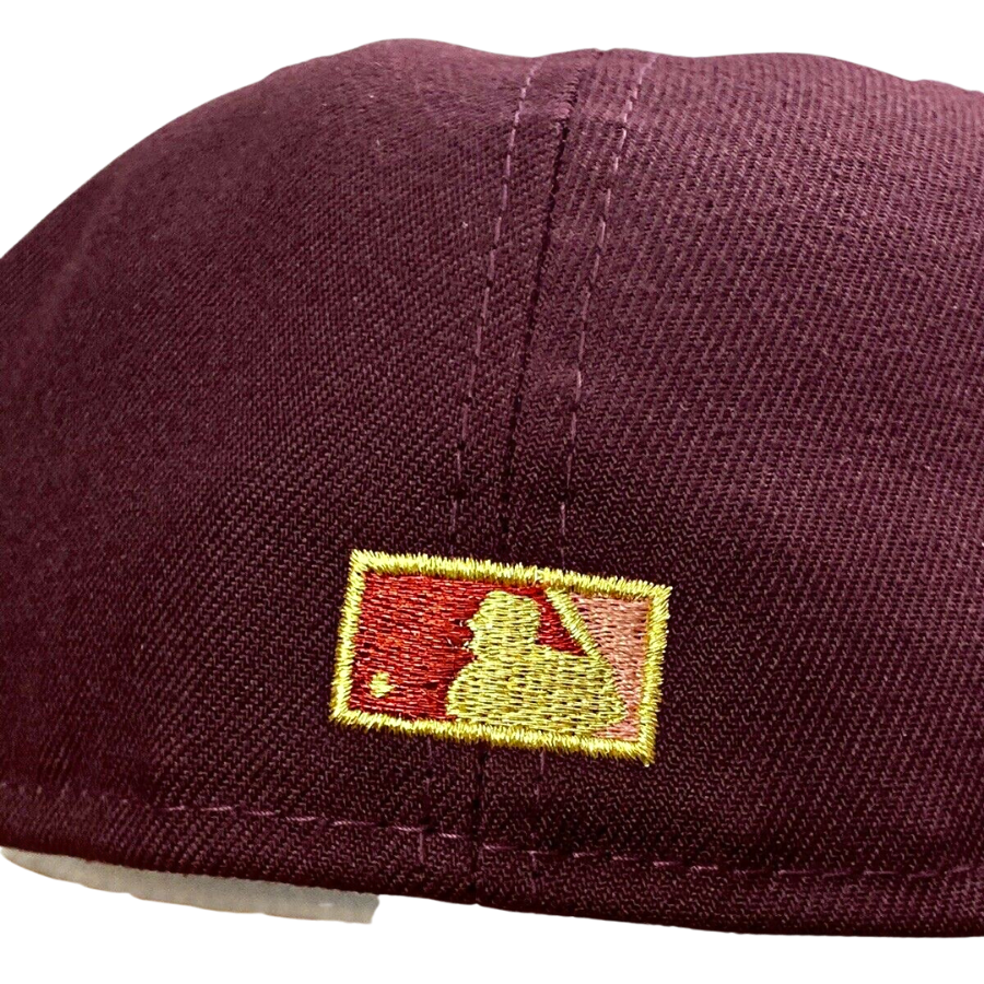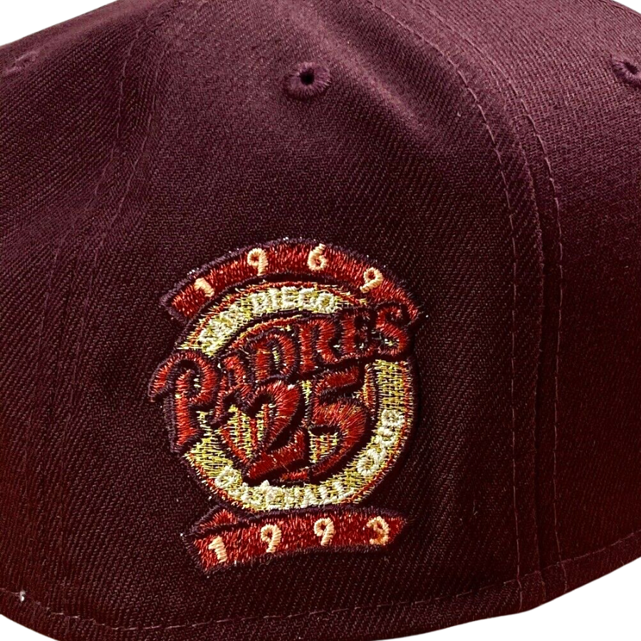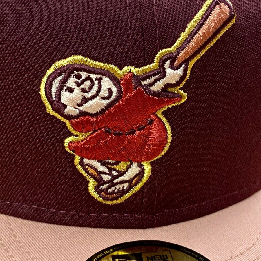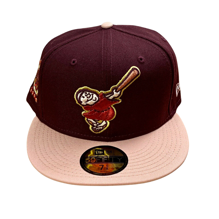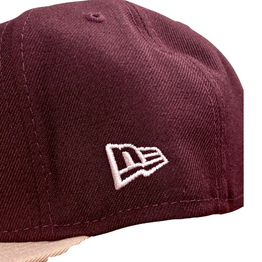 The New Era San Diego Padres "Red Velvet Strawberry Cheesecake" fitted hat is a My Fitteds exclusive release. The 59FIFTY fitted cap features a maroon six panel structured high crown and embroidered eyelets. The fabric squatchee button of the fitted and the flat bill are blush with a bronze bottom undervisor. The front panel features the Padres Swinging Friar logo embroidery. The right panel features a 25th Anniversary side patch embroidery. The fitted cap colorway was inspire by a red velvet strawberry cheesecake.