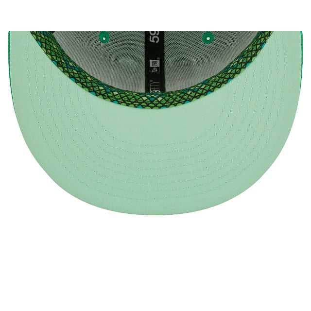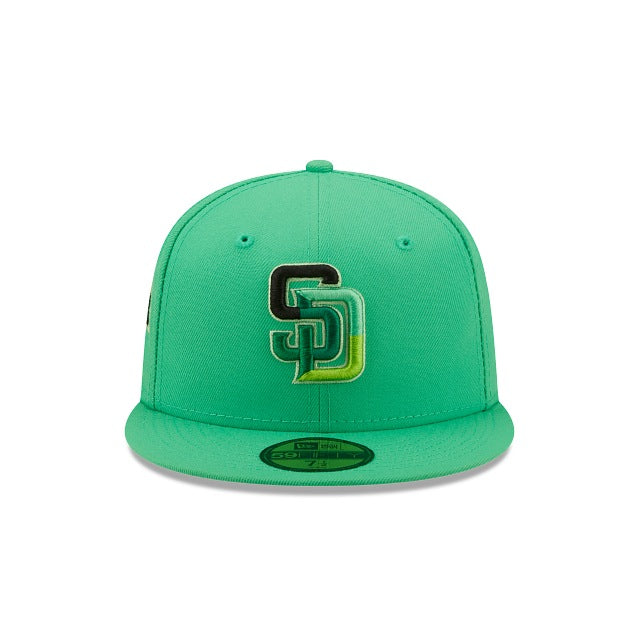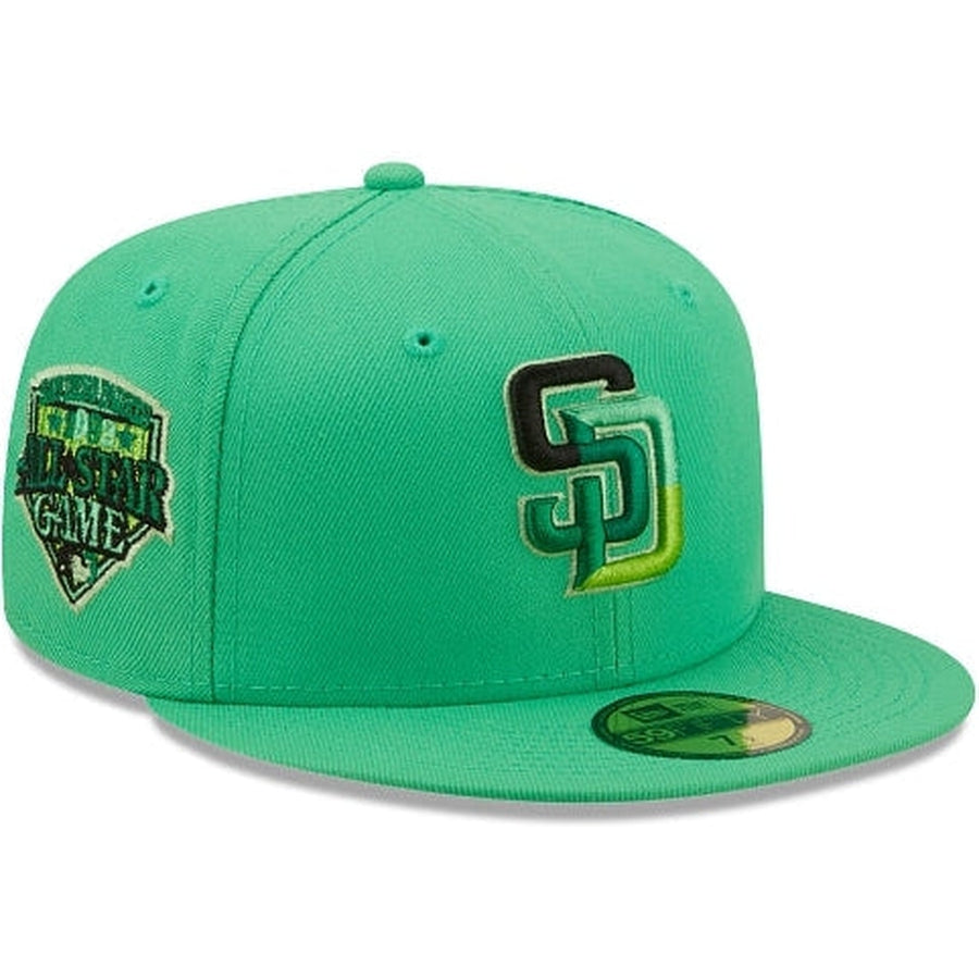 The San Diego Padres Snakeskin 59FIFTY Fitted Cap features an embroidered Padres multi-colored logo at the front panels, a 1992 All-Star Game patch at the right-wear side, and a matching MLB Batterman logo at the rear. Additional details include a snakeskin inspired inner sweatband and green undervisor.