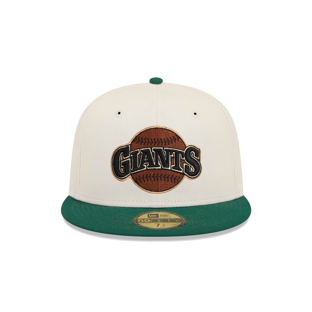 This San Francisco Giants 59FIFTY fitted hat was released by Crown Minded. The fitted has a chrome six panel structured high crown and embroidered eyelets with a green flat bill & fabric squatchee button. The fitted also has a grey bottom under bill with a black sweatband. The front panel features the San Francisco Giants logo embroidery with a matching chrome/green and brown side patch on the right panel. The left panel of the fitted displays the New Era logo and the official MLB Batterman embroidery on the rear crown.