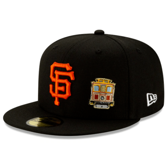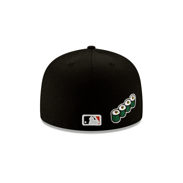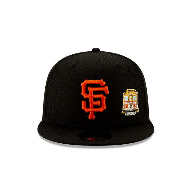 The San Francisco Giants Team Describe 59FIFTY Fitted Cap features an embroidered Giants logo at the front panels alongside a cable car with sushi rolls embroidered at the rear beside the official MLB logo.