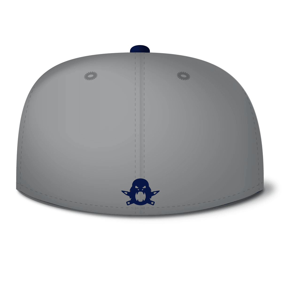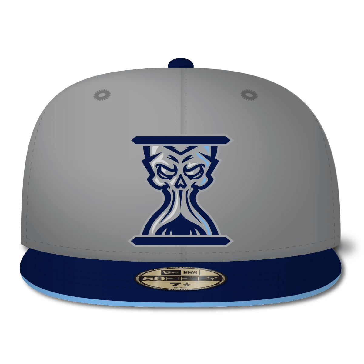 The New Era Sands of Time 59Fifty Fitted Hat was design by The Dopest Robot. The fitted hat has a grey 6 panel crown and embroidered eyelets. The fabric squatchee button ontop of the hat is navy blue. The brim of the fitted is navy blue with a sky bottom undervisor (sky blue). The front logo displays an hour glass with sand pouring to the bottom embroidered in navy blue thread. The upper half of the hour glass has a skull shaped frame and eyes. The back of the fitted hat has The Clink Room official logomark embroidered in navy blue thread.