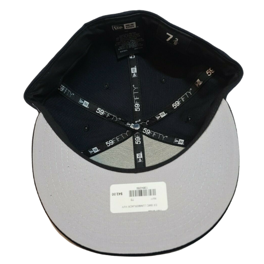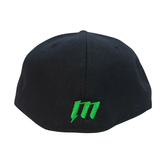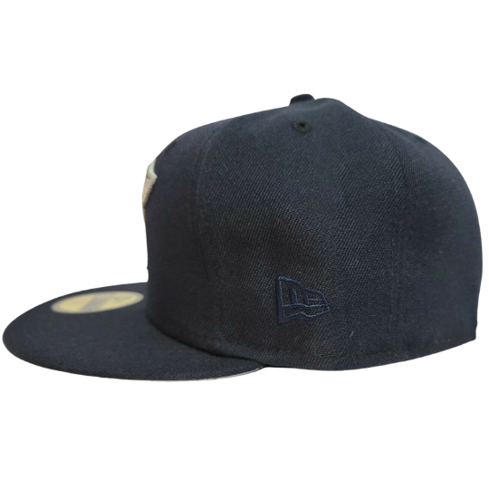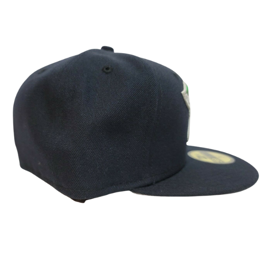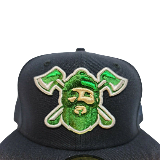 This New Era Sean McCarthy Lumberjack fitted hat has a navy blue and green colorway. The structured six panel high crown, embroidered eyelets and fabric squatchee button of the hat is navy blue. The flat bill of the fitted is also navy blue with a grey undervisor and black sweatband. The front panel features a lumberjack man head with two cross axes embroidered in green, white and cream thread.