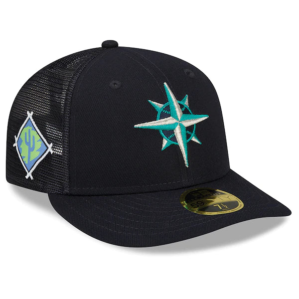 The wait is over! Get ready for the start of the 2022 MLB season in true Seattle Mariners style with this Spring Training Low Profile 59FIFTY Fitted Hat from New Era. This cap has a structured fit for a street-ready look, while the mesh back allows for more breathability. Best of all, the spirited embroidery on the front and the bold applique on the side further show off your excitement for the Seattle Mariners pursuit of a World Series!