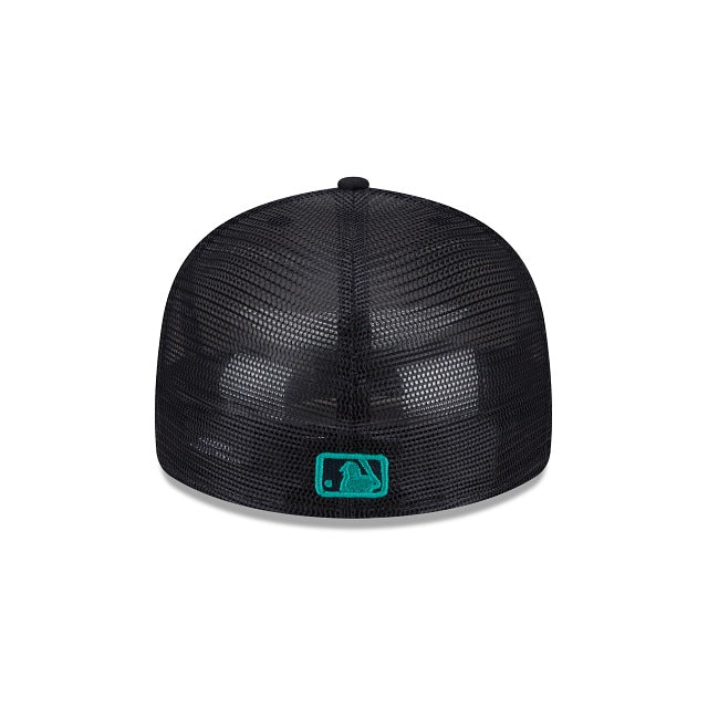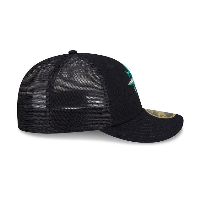 The Seattle Mariners 2023 Batting Practice Low Profile 59FIFTY Fitted Cap features an embroidered Mariners logo at the front panels with a matching MLB Batterman logo at the rear and a gray undervisor.