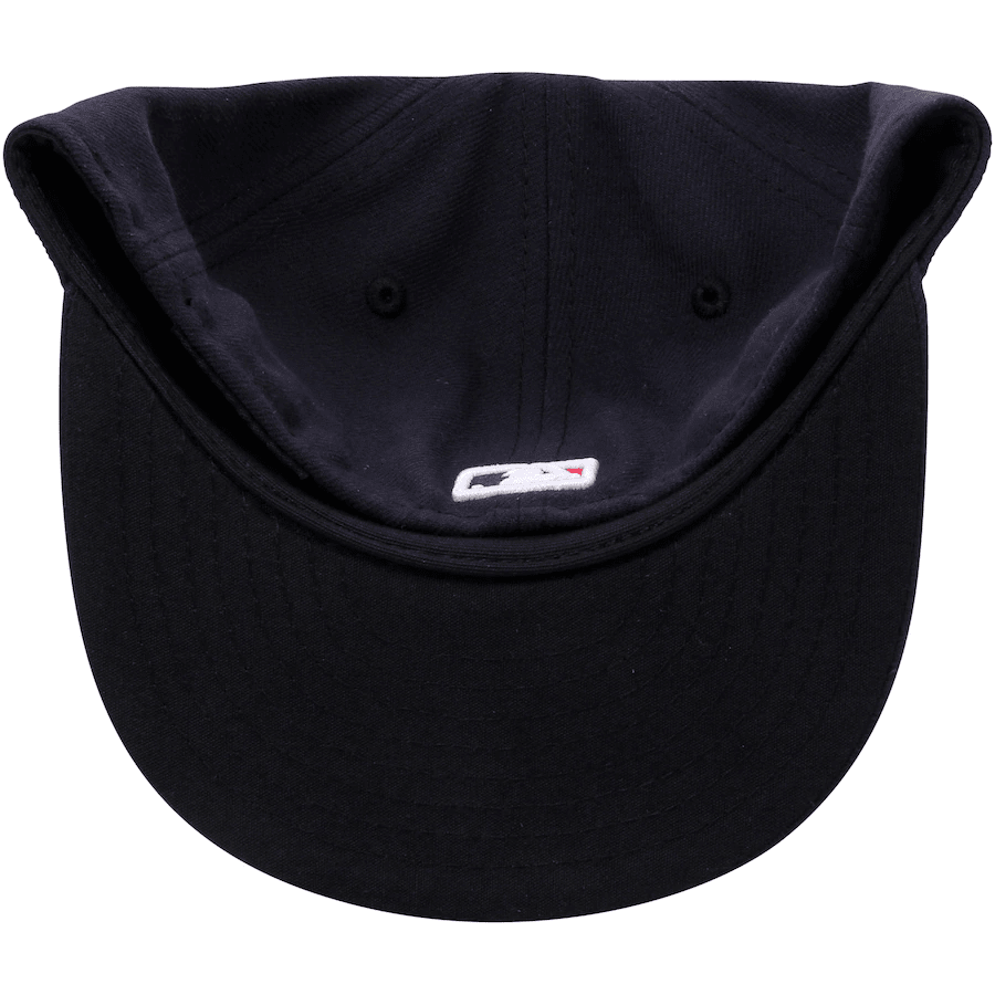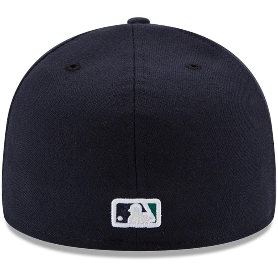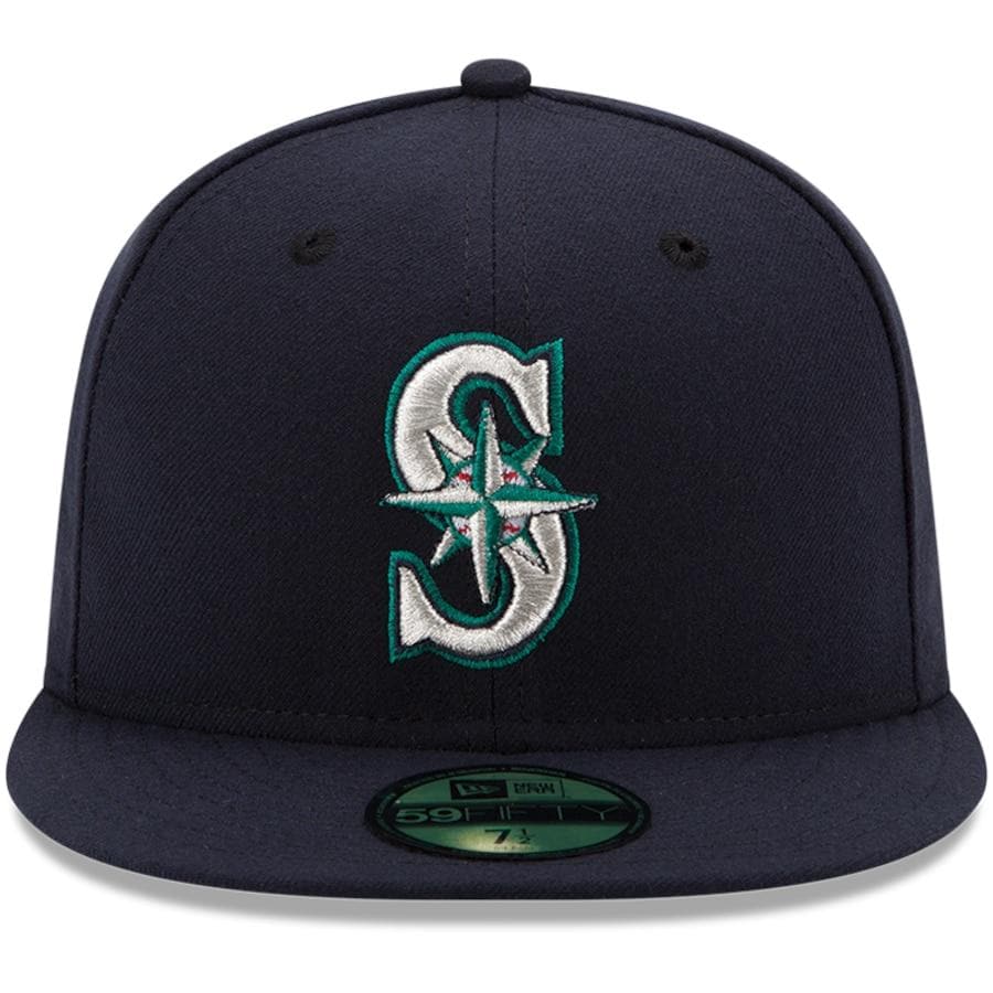 This is a New Era Seattle Mariners 59Fifty fitted hat for toddlers. The entire 6 panels of the fitted is navy blue including the squatchee button. On the front panel is the Seattle Mariners logo embroidered in white and teal threads. The over brim of the fitted and the under brim of the fitted is navy blue. On the backside of the fitted hat is the MLB official logo in embroidered in navy blue, white and teal threads. On the left is the iconic New Era flag embroidered in white thread.