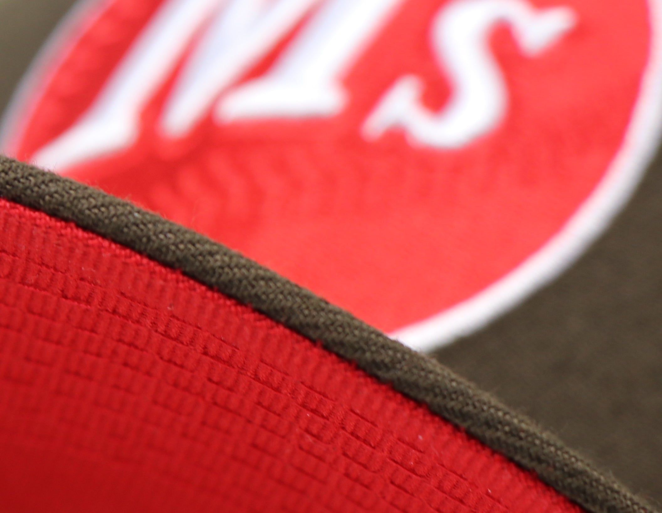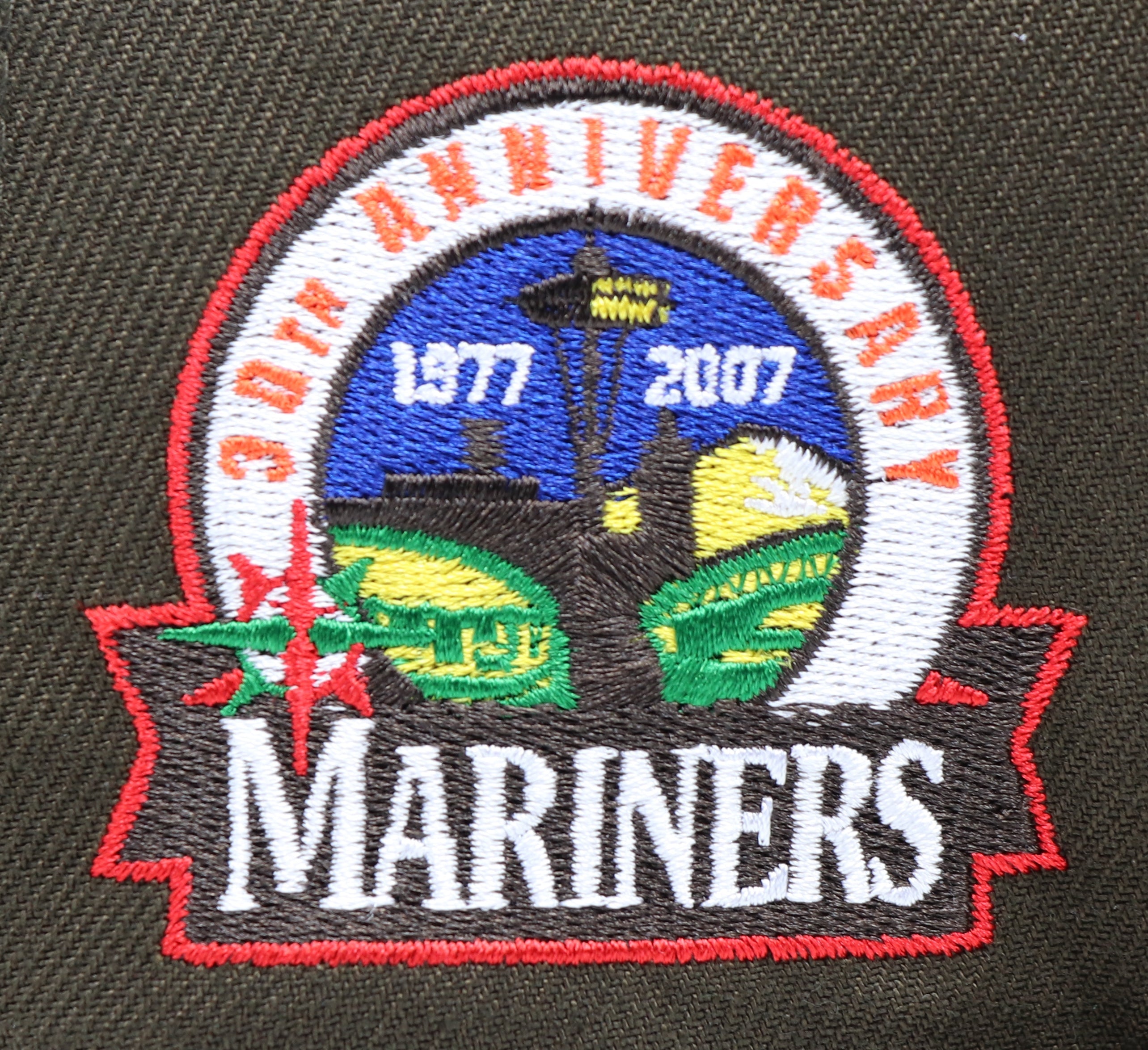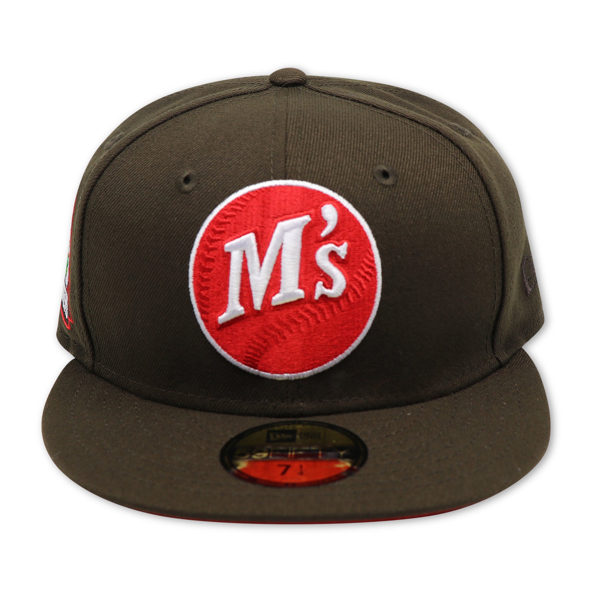 This New Era Seattle Mariners "M&M" Brown/Red 30th Anniversary 59FIFTY Fitted Hat is a 4ucaps exclusive. The fitted has a dark brown six panel structured high crown and embroidered eyelets with a dark brown fabric squatchee button. The fitted cap also has a dark brown flat bill with a red undervisor. The front panel features the Seattle Mariners throwback logo embroidery in red and a 30th Anniversary side patch embroidery on the right panel. The left panel of the fitted displays the New Era logo and the official MLB logo embroidery on the rear crown.