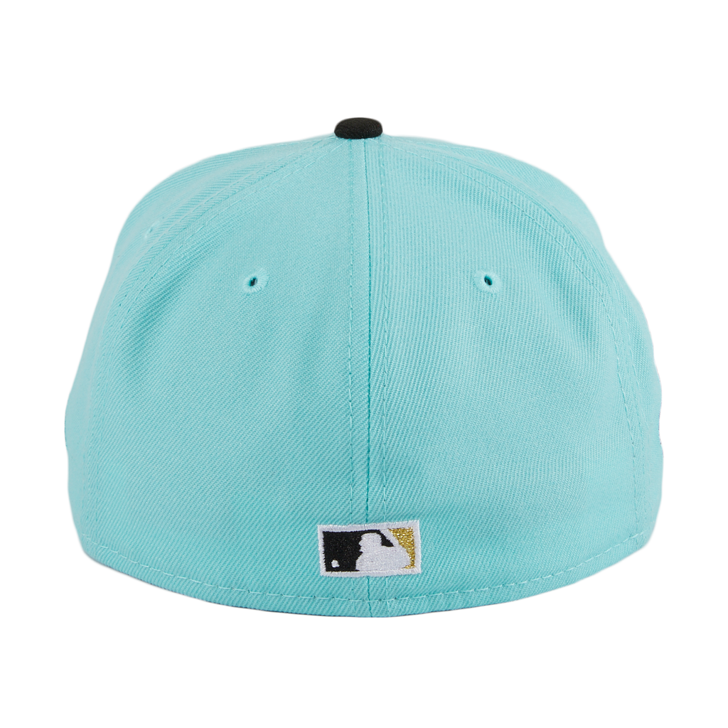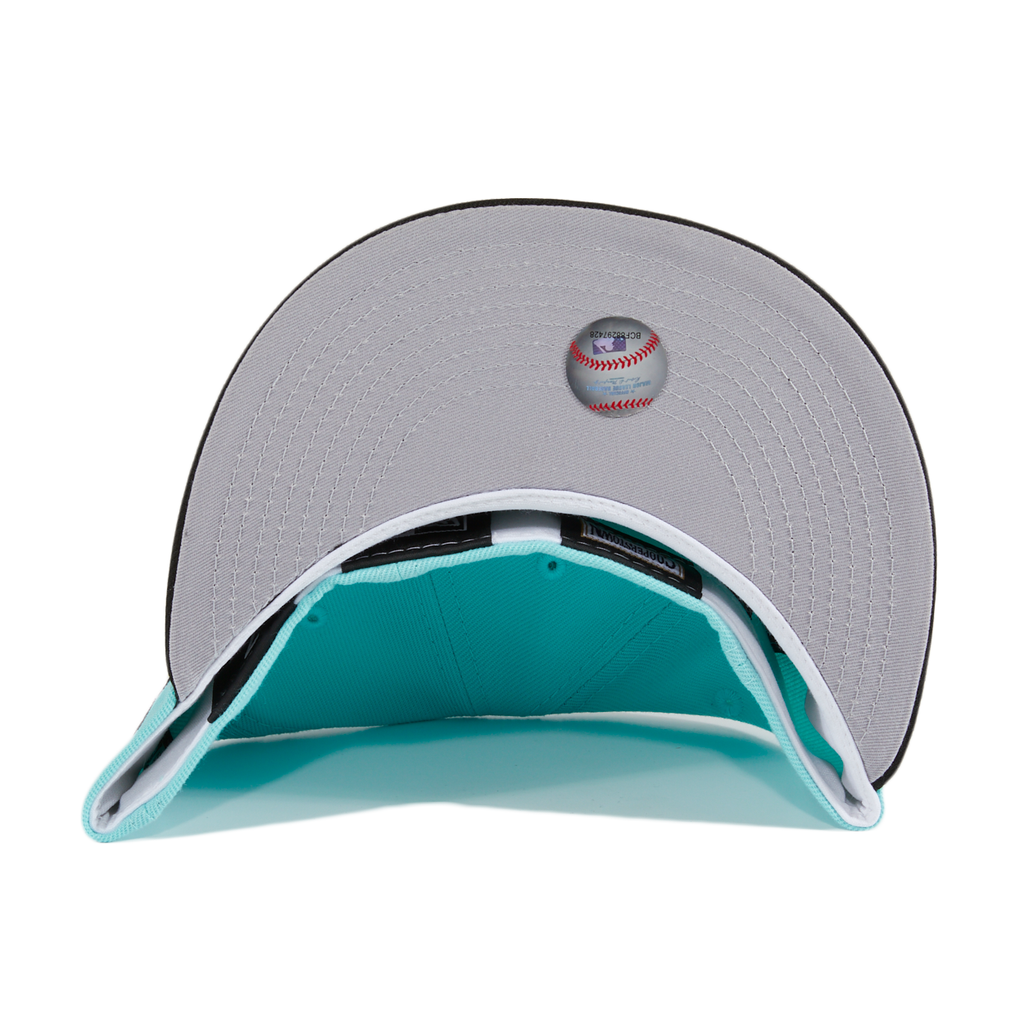 The New Era Seattle Mariners Mint Conditions 25th Anniversary Fitted Hat is a Hat Club exclusive fitted. The cap features a mint blue, black, gold and white colorway. The structured six panel high crown and embroidered eyelets are mint blue. The fabric squatchee button and flat bill of the fitted is black with a grey bottom undervisor and white sweatband. The front panel features the Seattle Mariners logo embroidered in black, gold and white threads. The left panel features the New Era logo embroidered in mint blue thread. The right panel features a 25th Anniversary side patch embroidered in the same colorway as the cap. Because this is a Hat Club exclusive there are limited quantities available and these types of hat will become rare. The Seattle Mariners Mint Conditions fitted cap is ideal for Mariners fans and hat collectors.