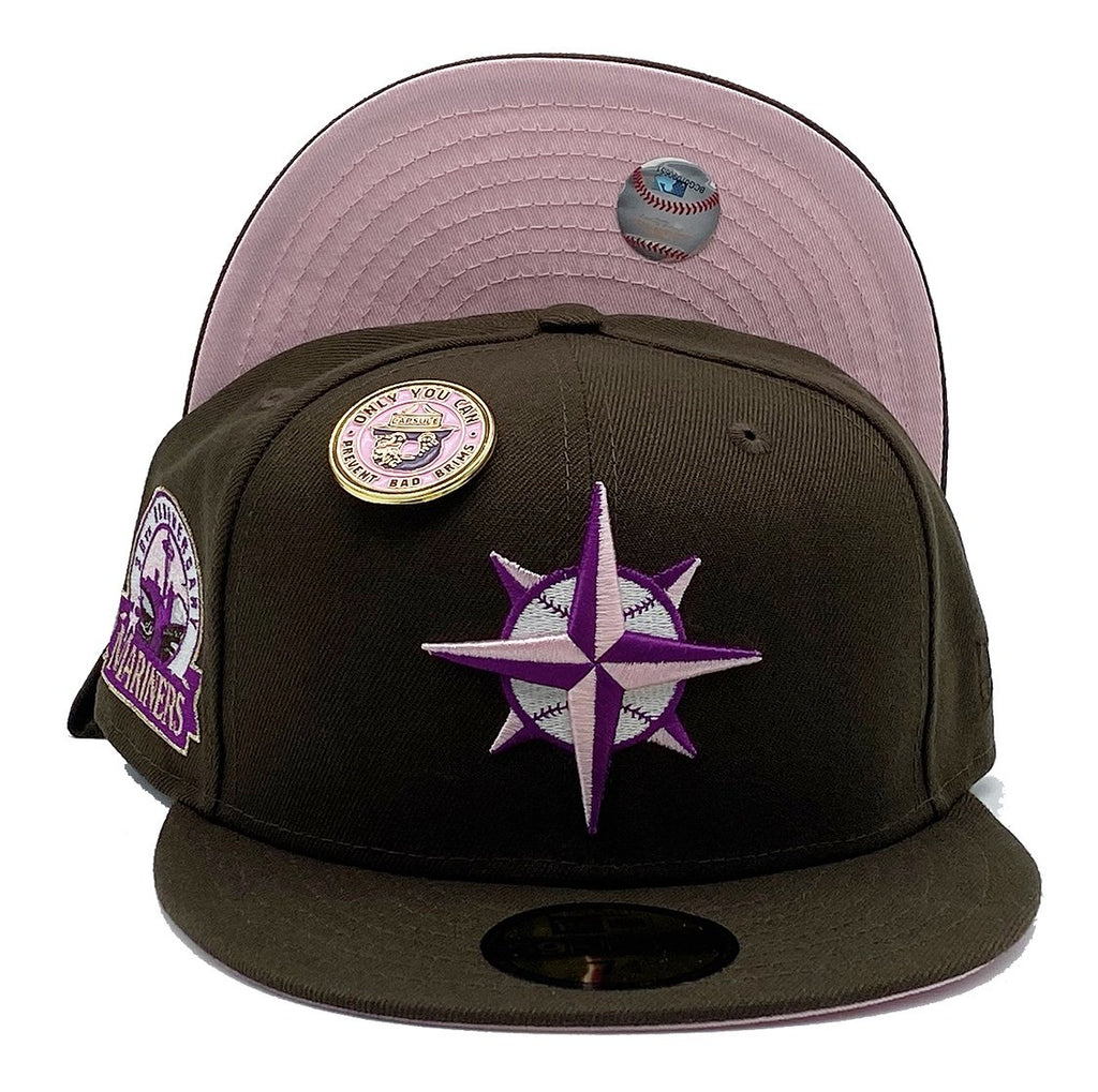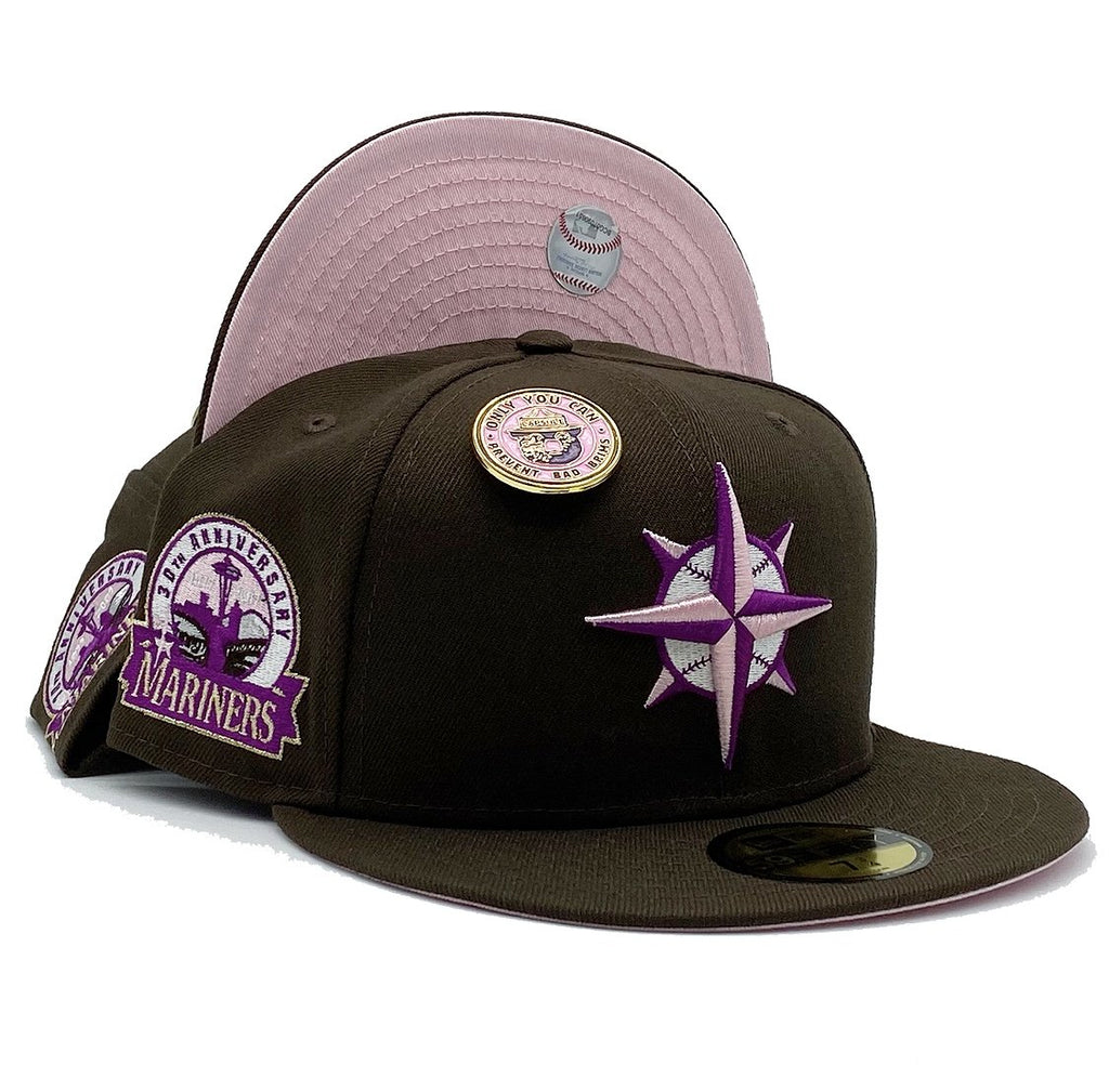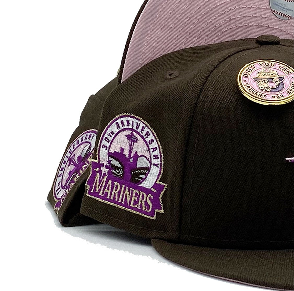 The New Era Seattle Mariners No Bad Brims fitted hat is a Capsule Hat exclusive. The fitted cap features a dark brown six panel structured high crown, embroidered eyelets and fabric squatchee button. The flat bill of the fitted is also dark brown with a soft pink undervisor and black sweatband. The front panel features the Mariners logo embroidered in purple and soft pink threads. The right panel features a 30th Anniversary side patch embroidered in purple, soft pink and gold colorway.
