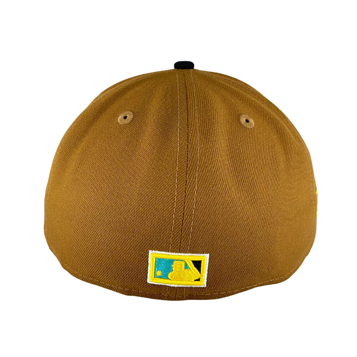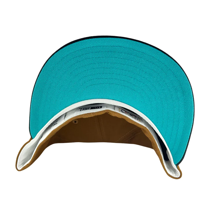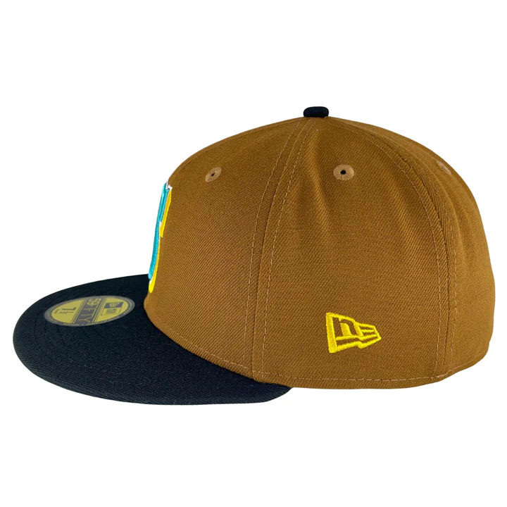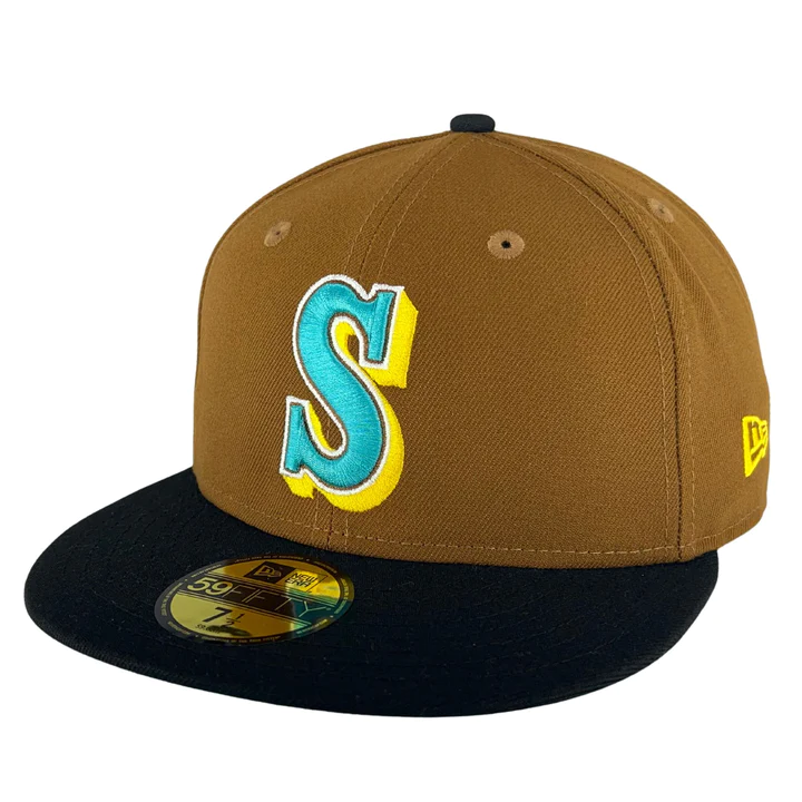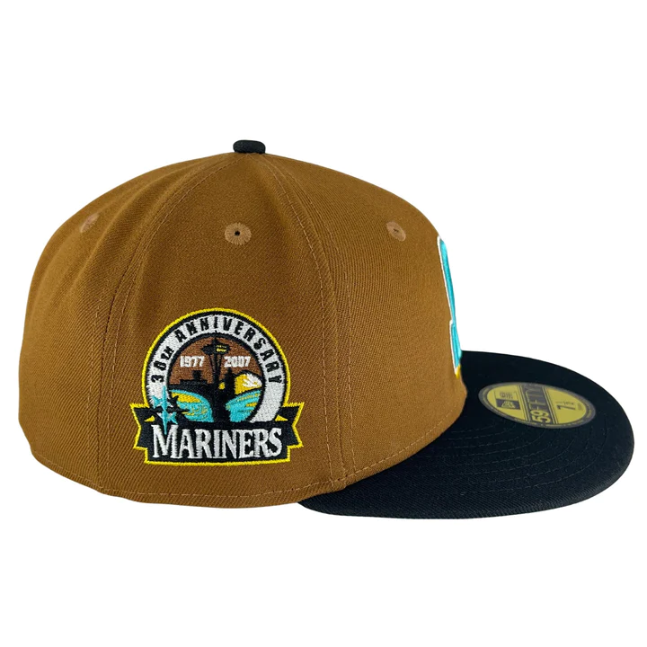 This New Era Seattle Mariners 30th Anniversary "Scooby Doo" Inspired 59FIFTY Fitted Hat has a light brown six panel structured high crown and embroidered eyelets with a light brown fabric squatchee button. The fitted cap has a black flat bill with a _ undervisor. The front panel features the Seattle Mariners logo embroidery and a _ side patch embroidery on the right panel. The left panel of the fitted displays the New Era logo and the official MLB logo embroidery on the rear crown.